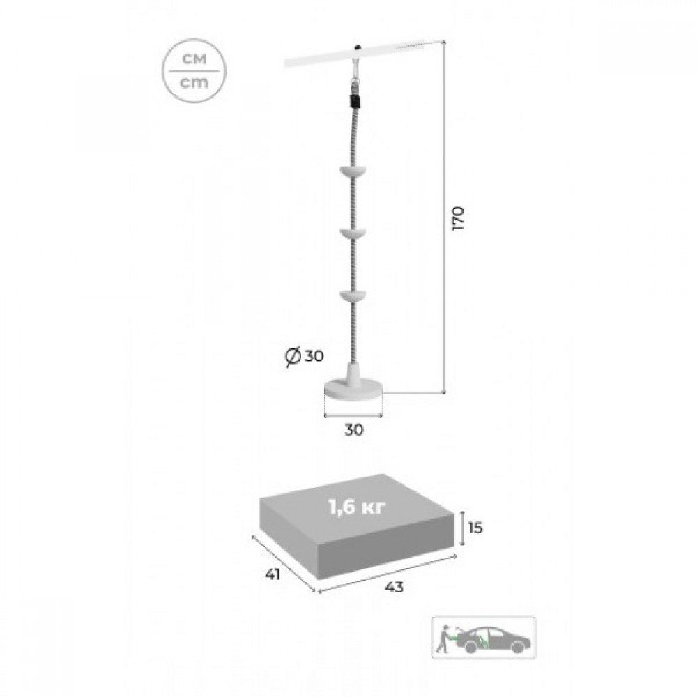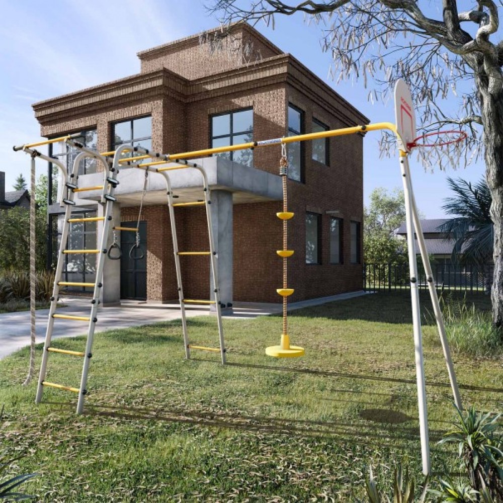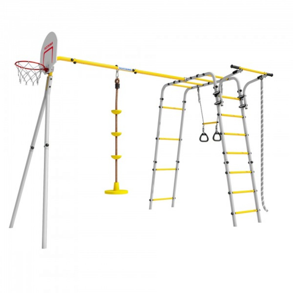Комплектация: баскетбольное кольцо (d=0,3 м), канат, кольца с перекладиной, гимнастическая лестница, рукоход, турник подвижный, качели диск