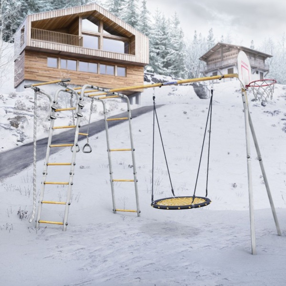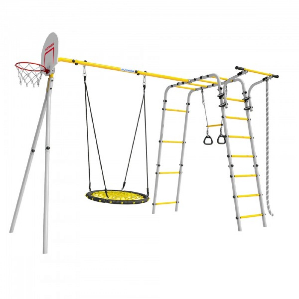 Комплектация: баскетбольное кольцо (d=0,3 м), канат, кольца с перекладиной, гимнастическая лестница, рукоход, турник подвижный, качели гнездо сетка 80 см