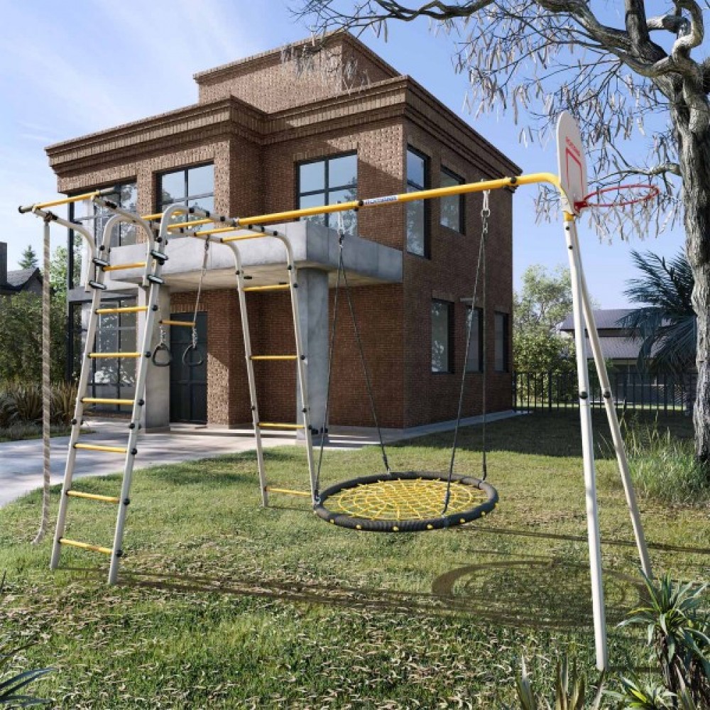 Комплектация: баскетбольное кольцо (d=0,3 м), канат, кольца с перекладиной, гимнастическая лестница, рукоход, турник подвижный, качели гнездо-сетка 100 см