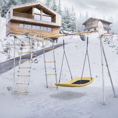 Комплектация: баскетбольное кольцо (d=0,3 м), канат, кольца с перекладиной, гимнастическая лестница, рукоход, турник подвижный, качели лодка