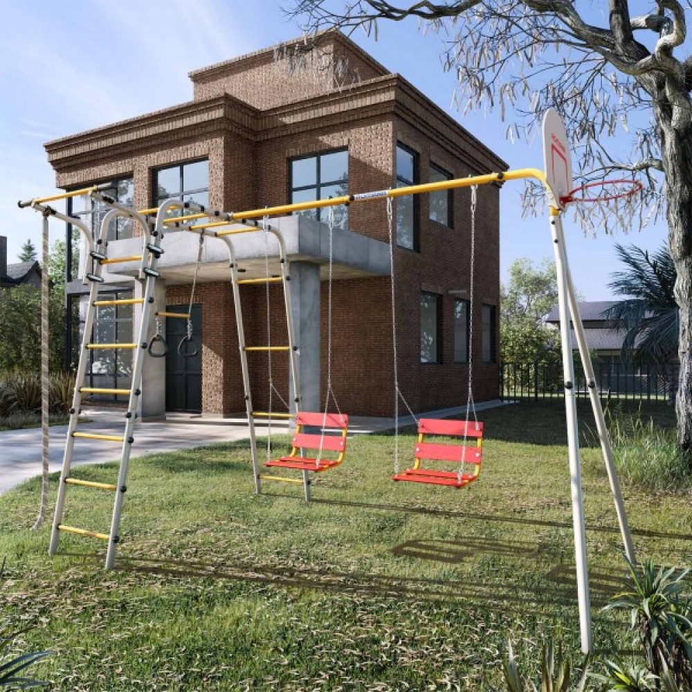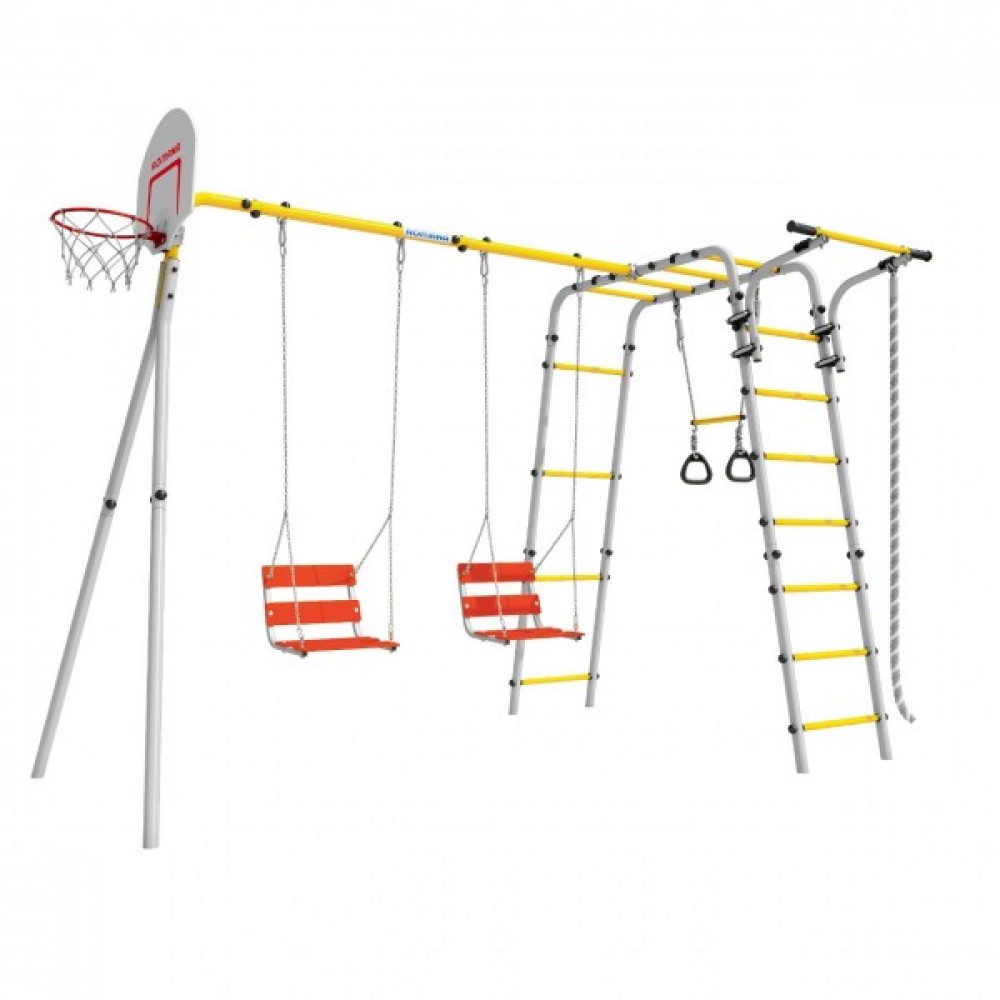 Комплектация: баскетбольное кольцо (d=0,3 м), канат, кольца с перекладиной, гимнастическая лестница, рукоход, турник подвижный, качели цепные