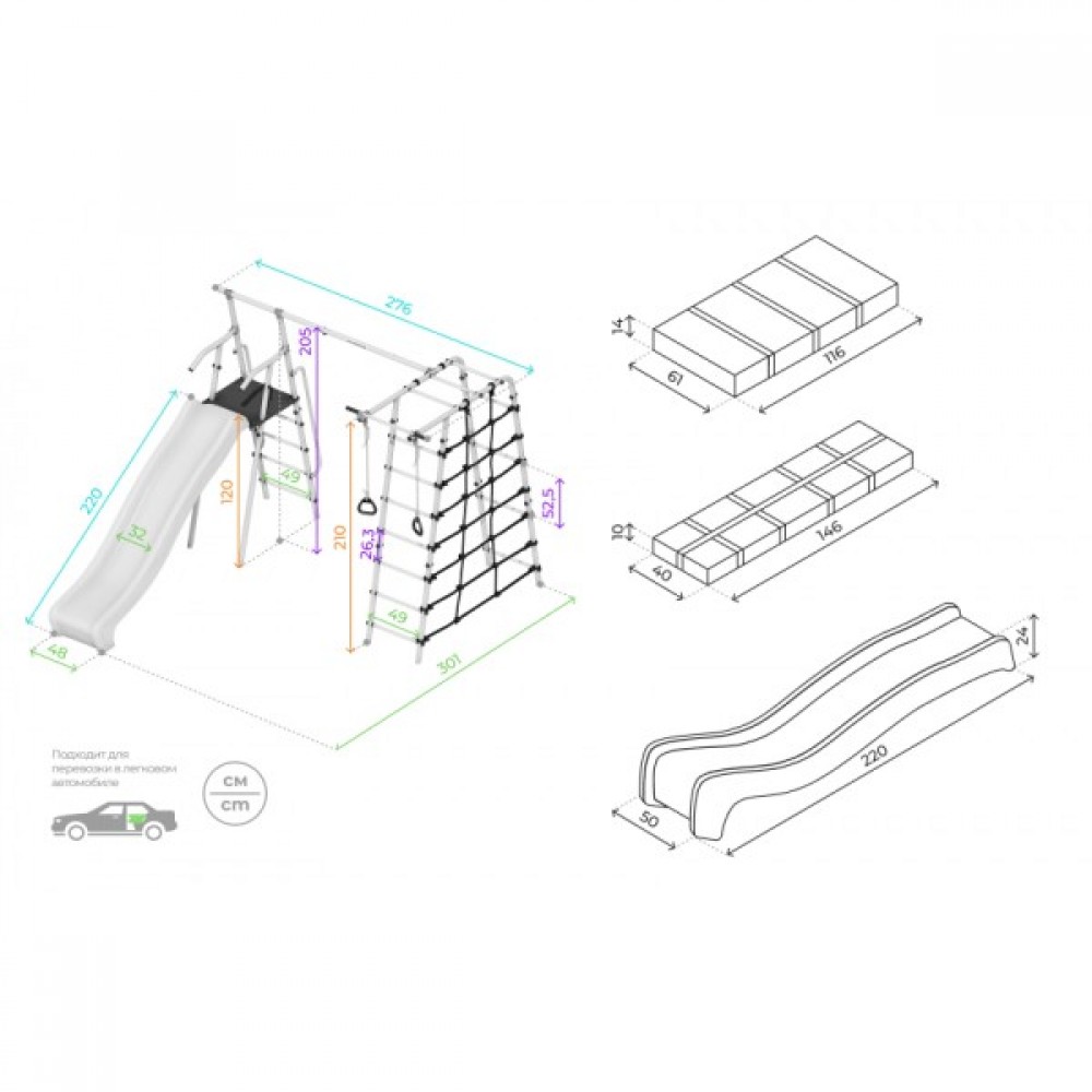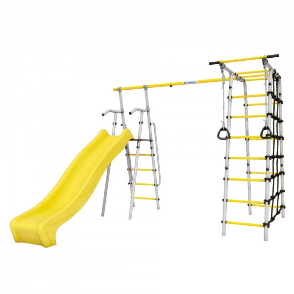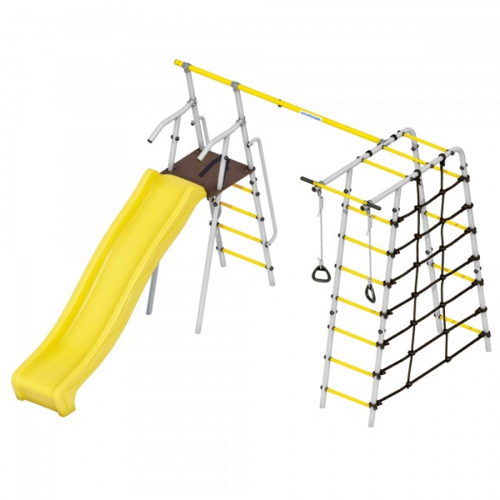 Комплектация: горка, кольца, веревочный лаз, гимнастическая лестница, неподвижный турник