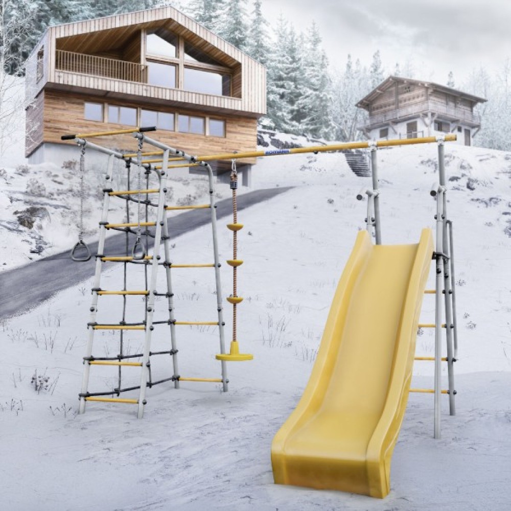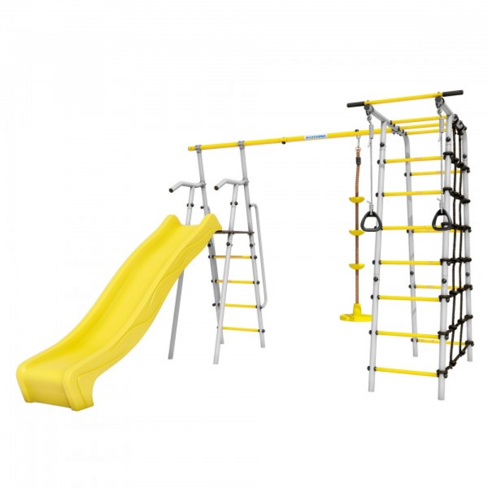 Комплектация: горка, кольца, веревочный лаз, гимнастическая лестница, неподвижный турник, качели диск