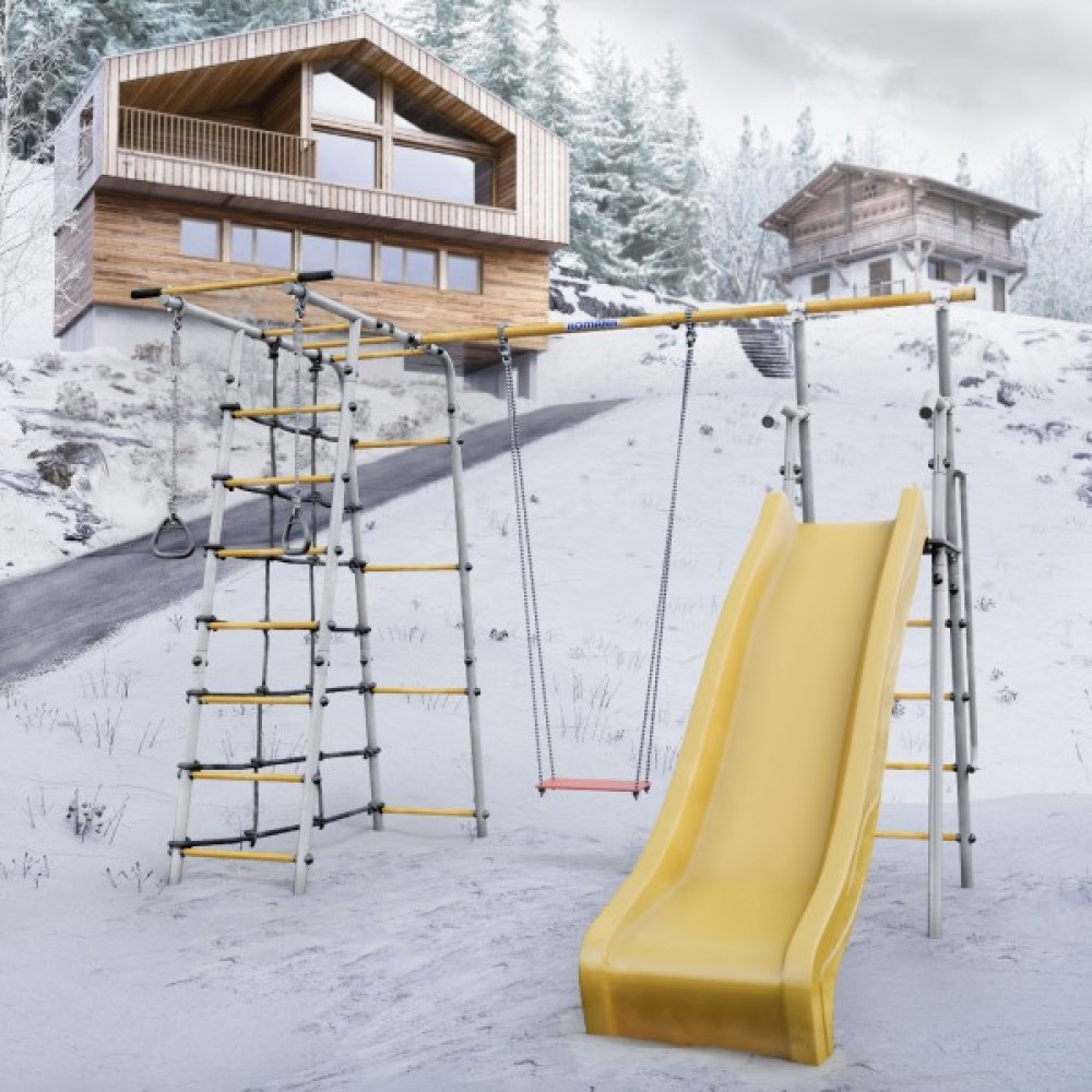 Комплектация: горка, кольца, веревочный лаз, гимнастическая лестница, неподвижный турник, качели фанерные