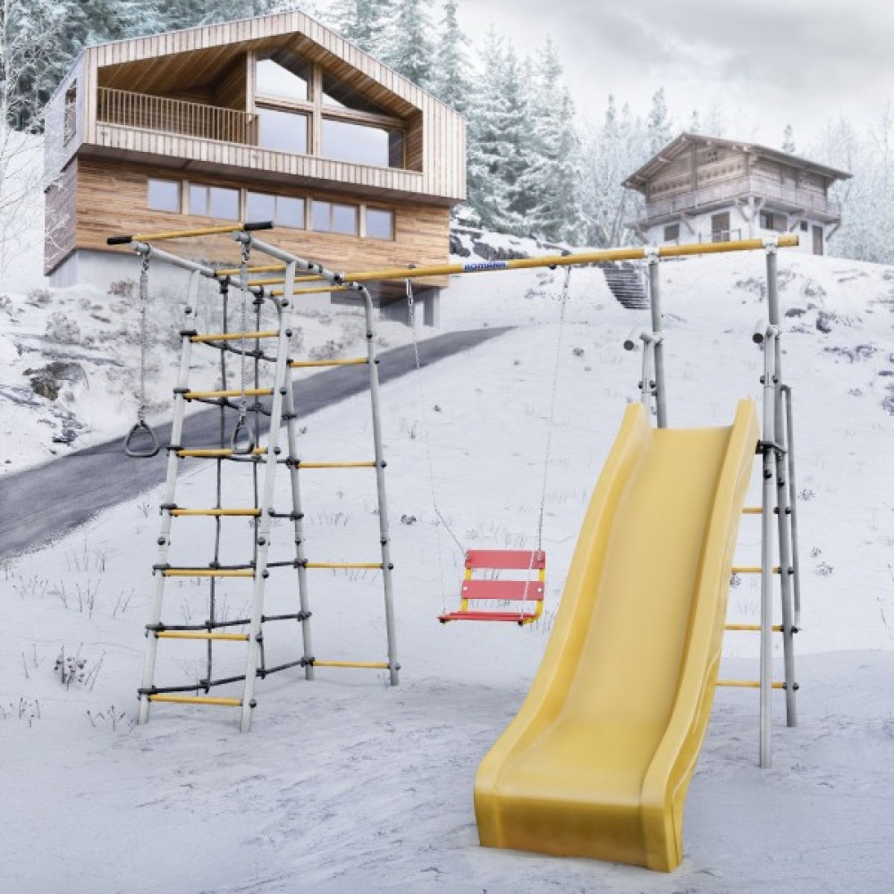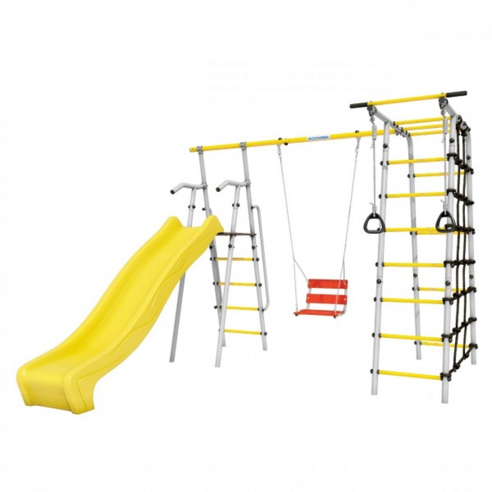 Комплектация: горка, кольца, веревочный лаз, гимнастическая лестница, неподвижный турник, качели цепные