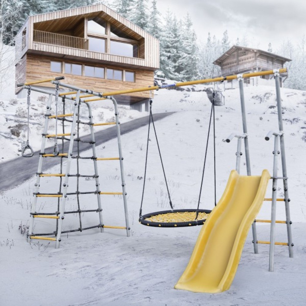 Комплектация: горка, кольца, сетка веревочного лаза, гимнастическая лестница, рукоход, турник неподвижный, качели гнездо-сетка 100 см