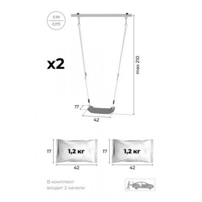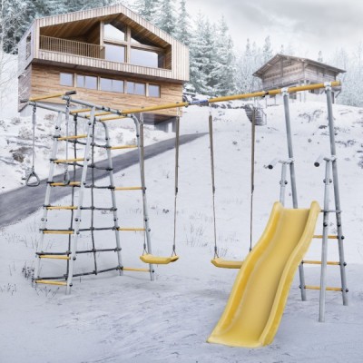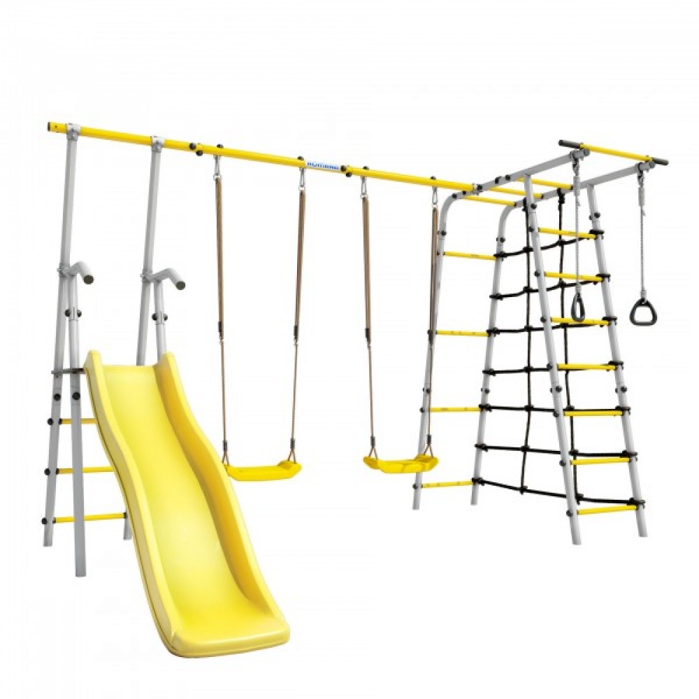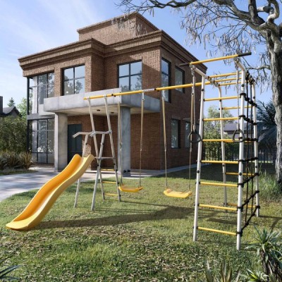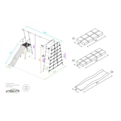 Комплектация: горка, кольца, сетка веревочного лаза, гимнастическая лестница, рукоход, турник неподвижный, качели пластиковые