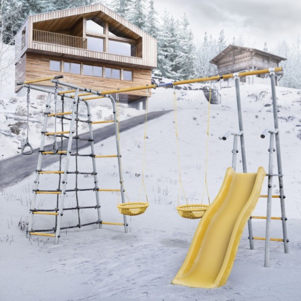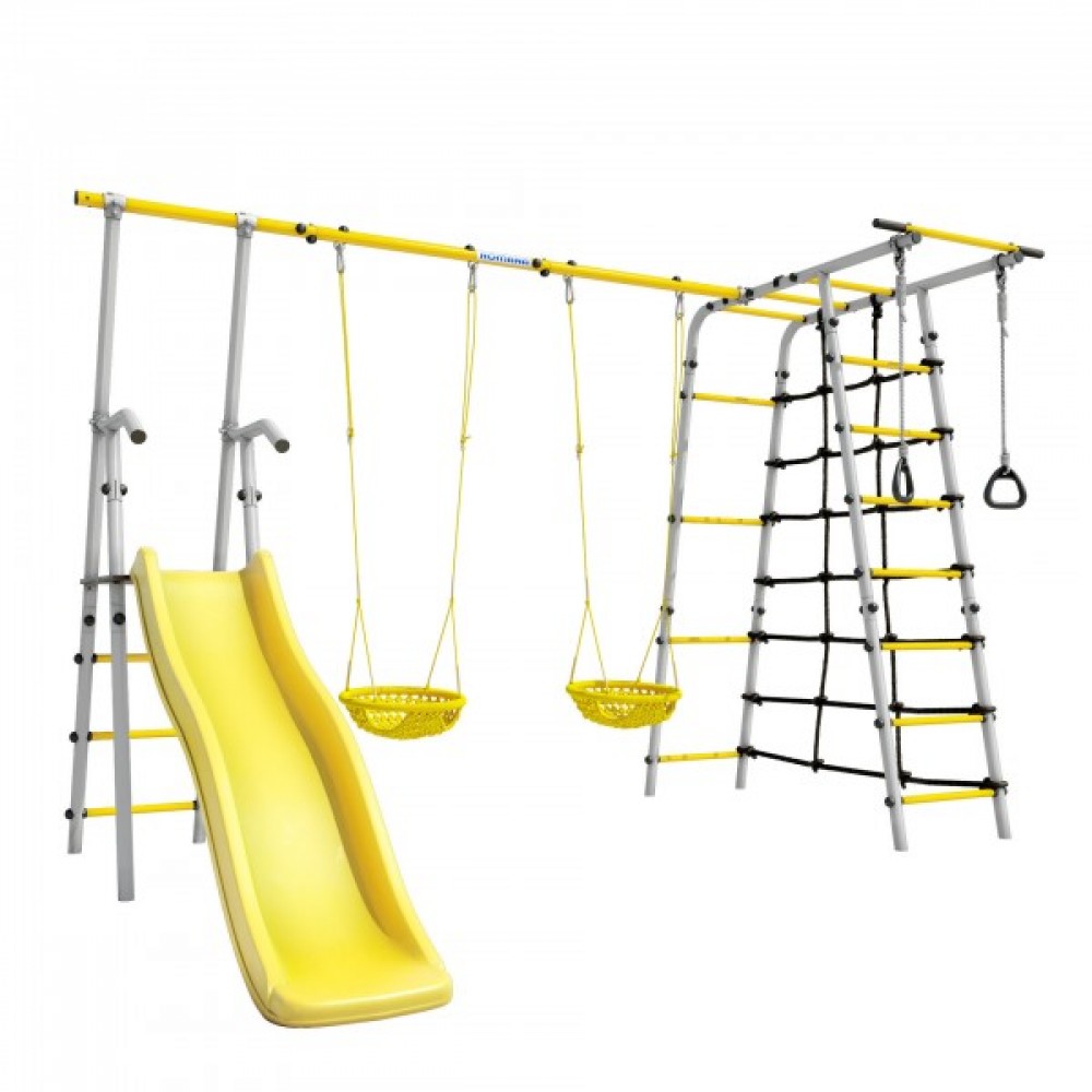 Комплектация: горка, кольца, сетка веревочного лаза, гимнастическая лестница, рукоход, турник неподвижный, качели сетка