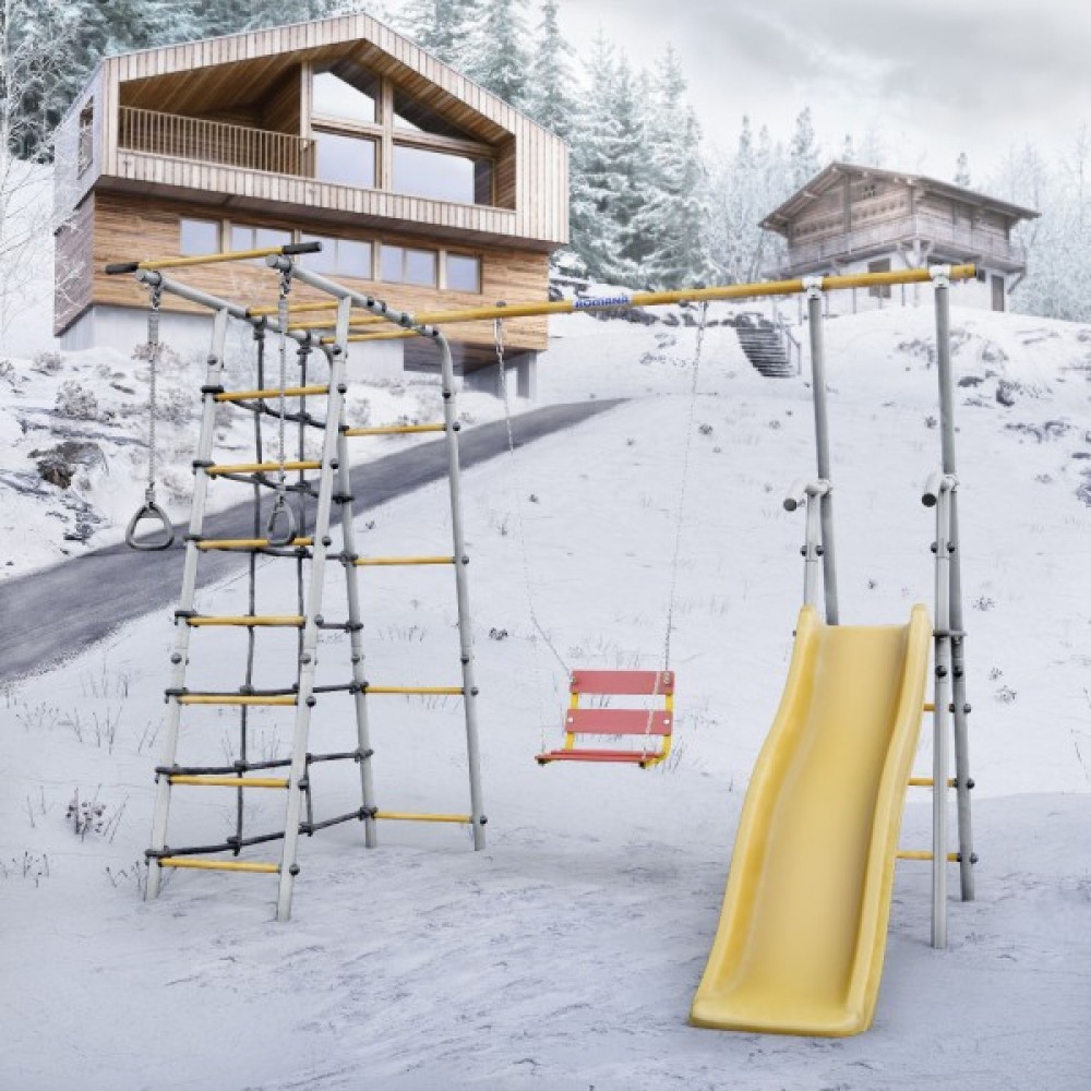 Комплектация: горка, кольца, веревочный лаз, гимнастическая лестница, турник неподвижный, качели цепные