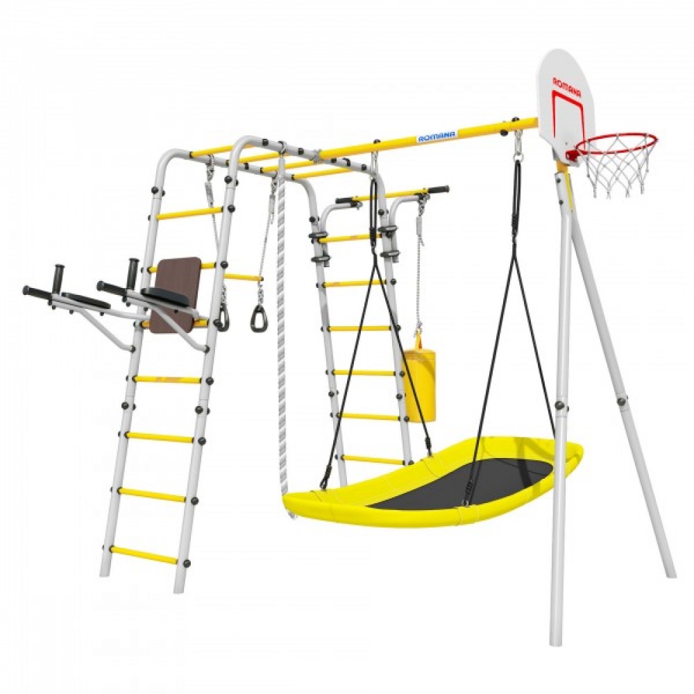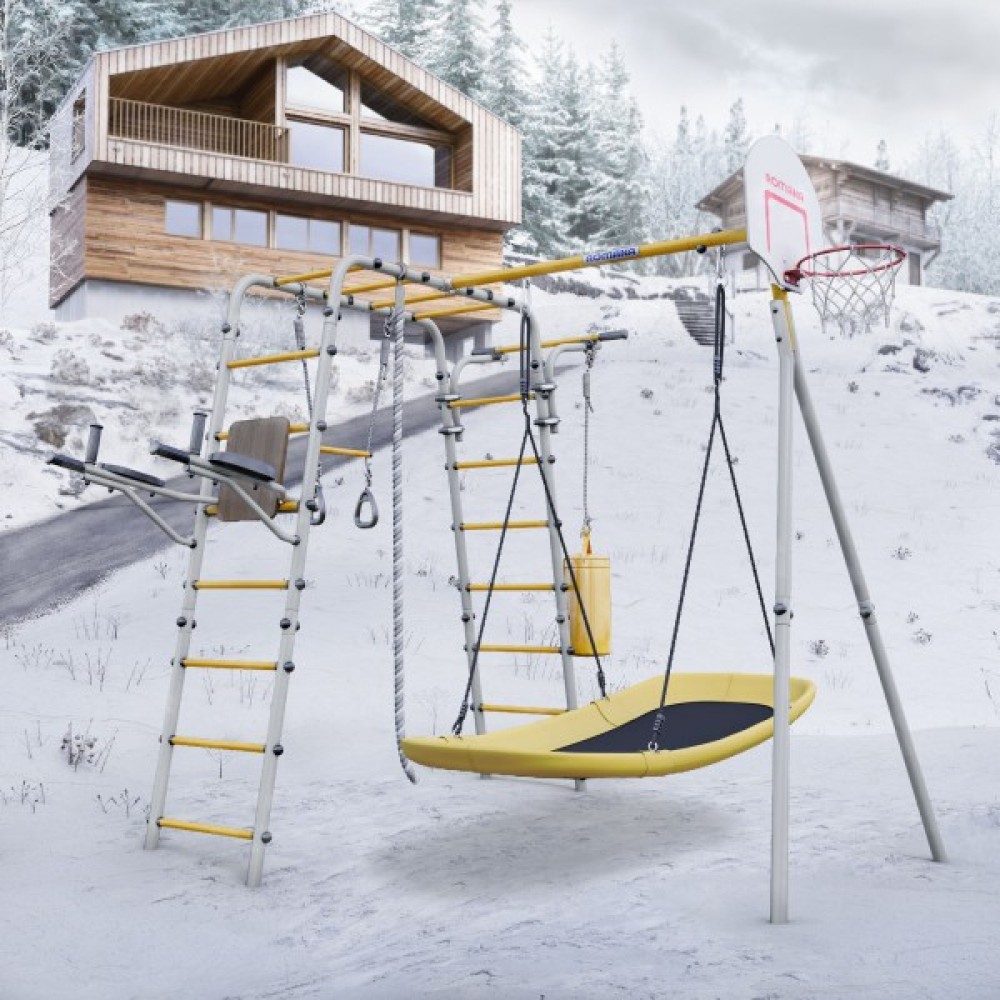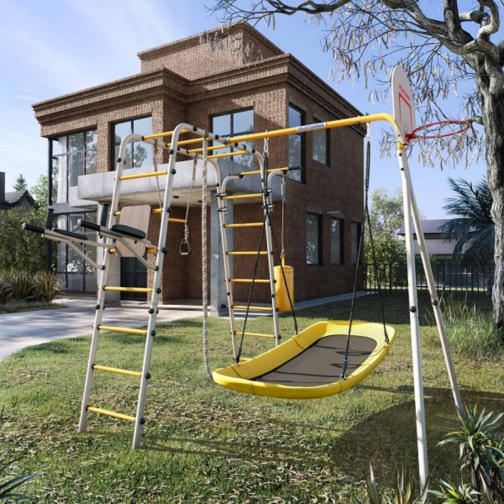 Комплектация: баскетбольный щит, груша боксерская, брусья, канат, кольца с перекладиной, гимнастическая лестница, рукоход, турник подвижный, качели лодка