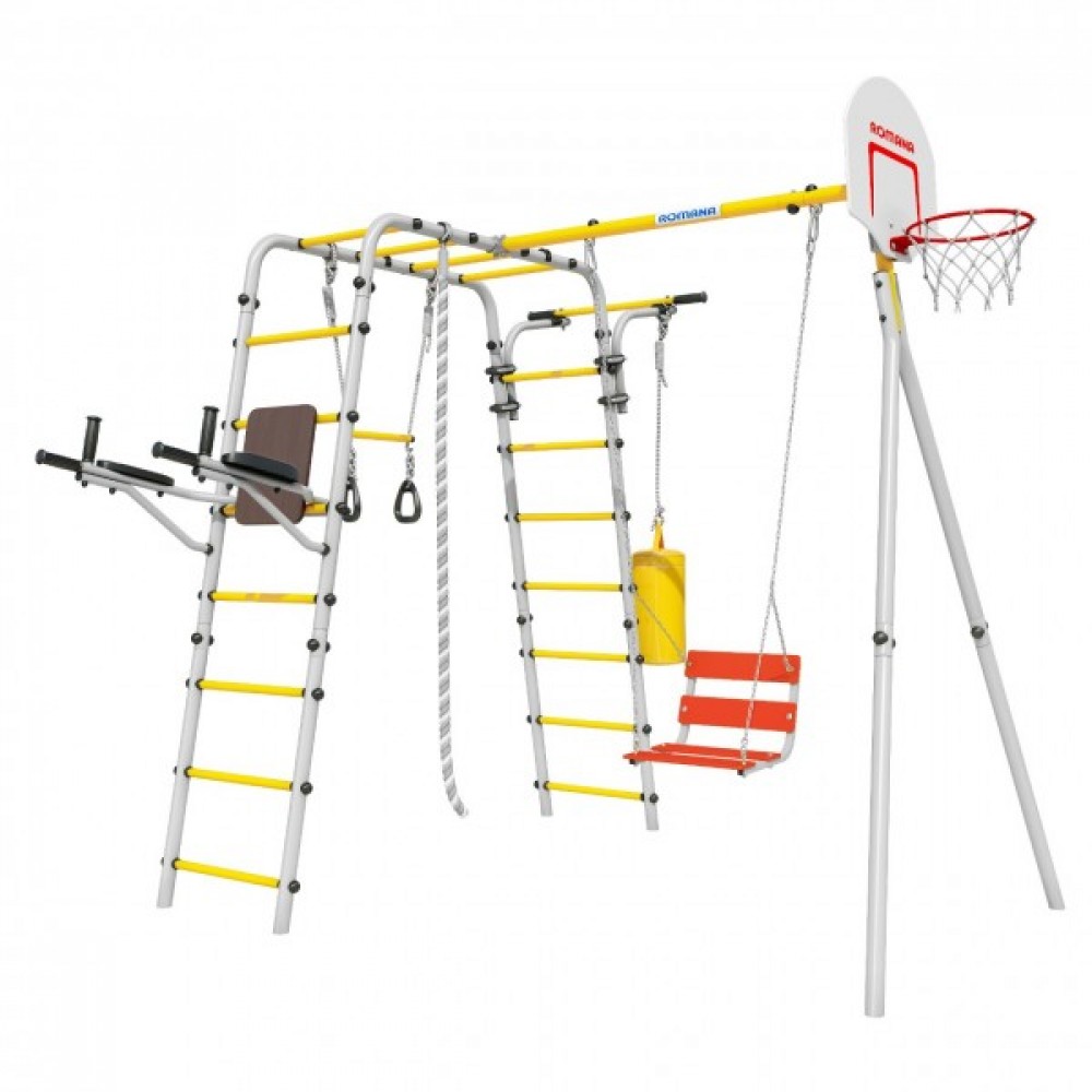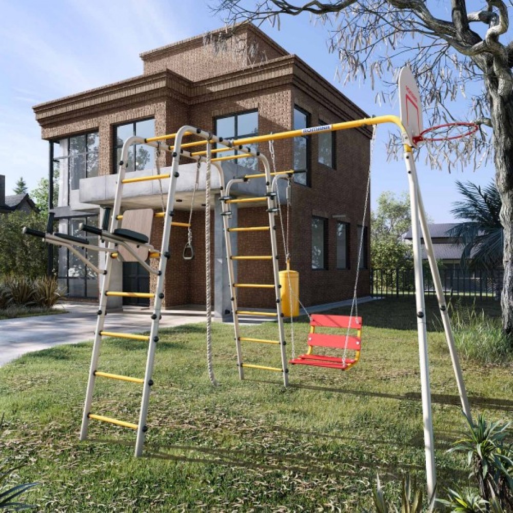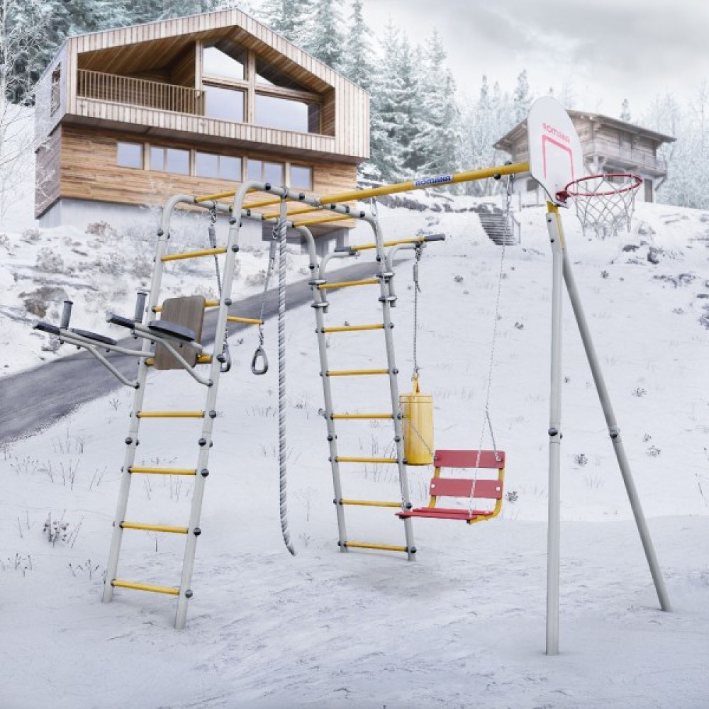 Комплектация: баскетбольный щит, груша боксерская, брусья, канат, кольца с перекладиной, гимнастическая лестница, рукоход, турник подвижный, качели цепные