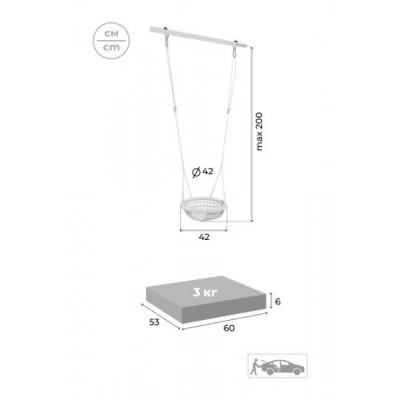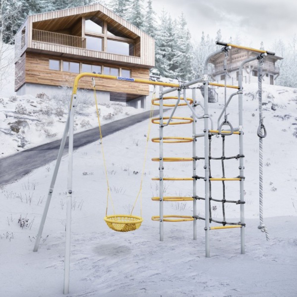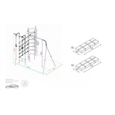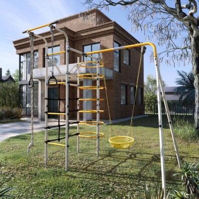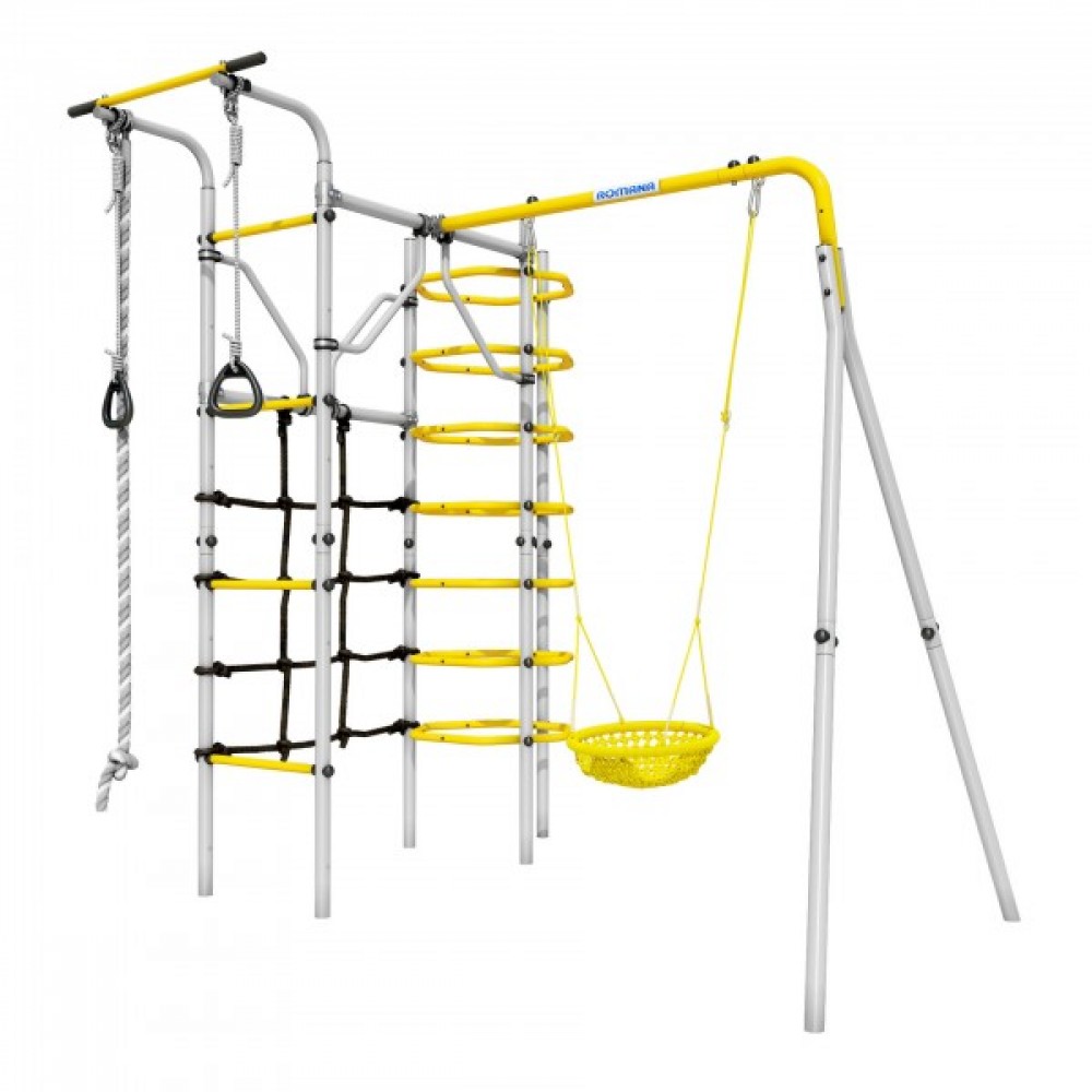 Комплектация: канат, кольца, веревочный лаз, лаз кольцевой, турник неподвижный, качели сетка