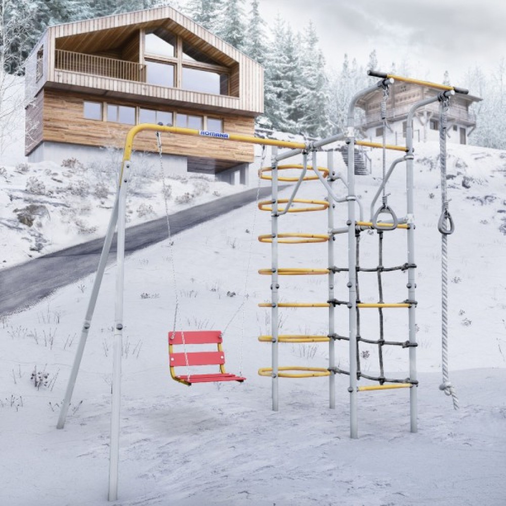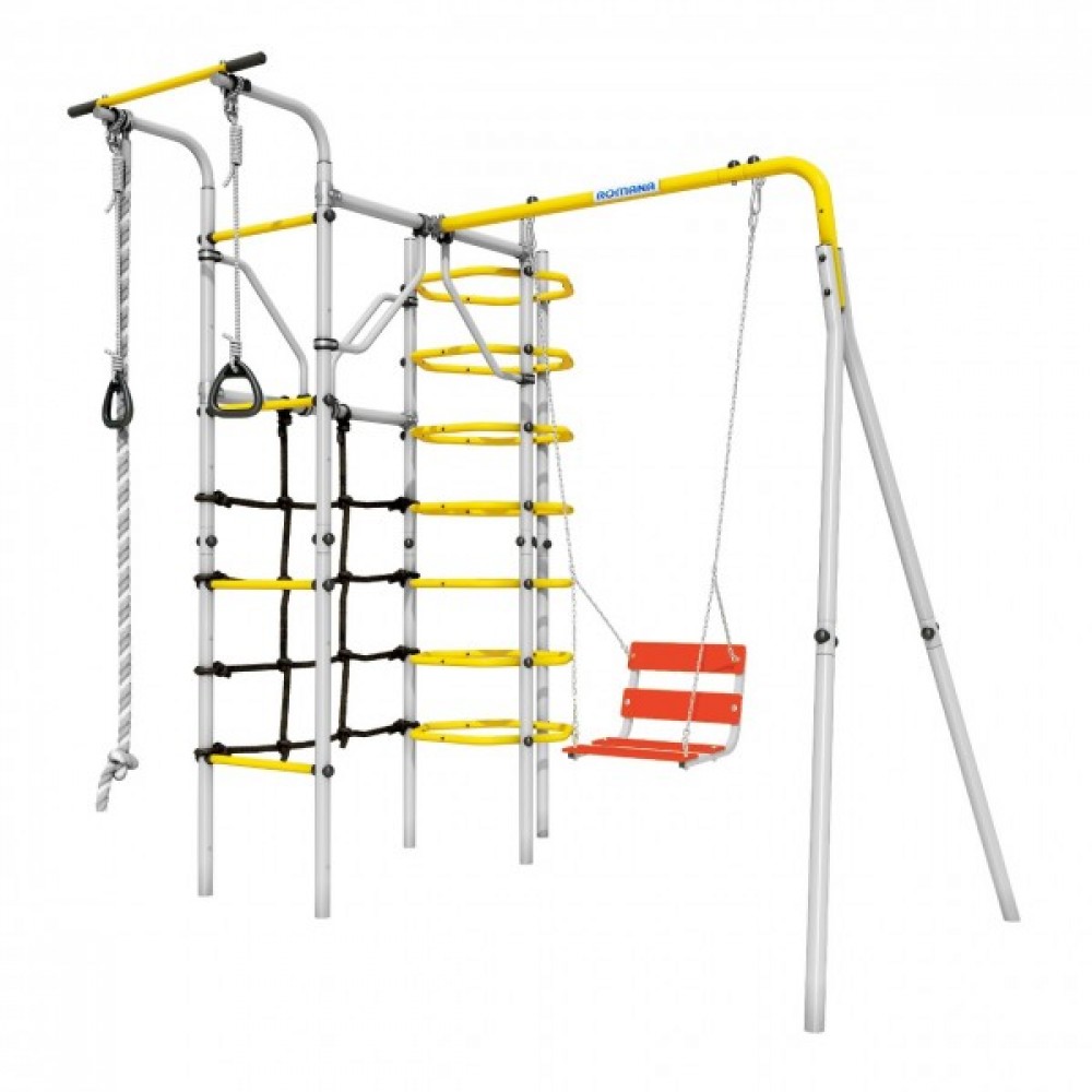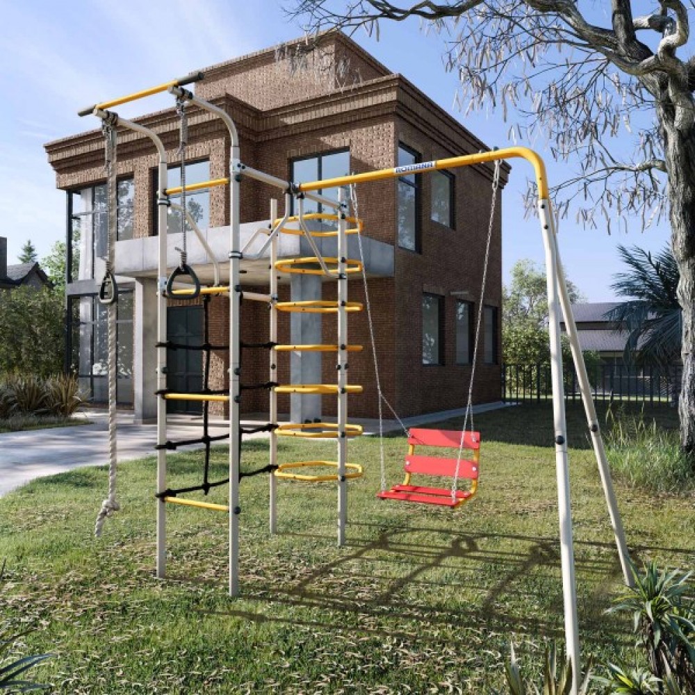 Комплектация: канат, кольца, веревочный лаз, лаз кольцевой, турник неподвижный, качели цепные