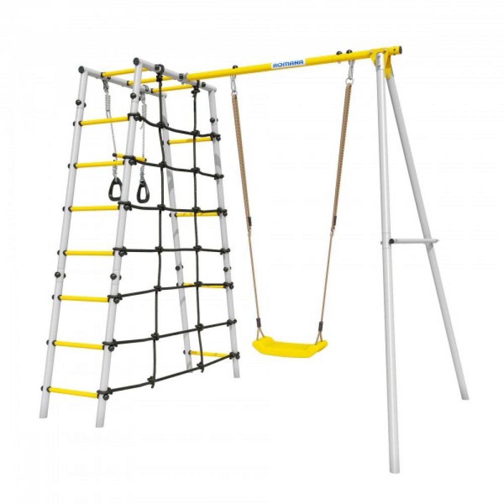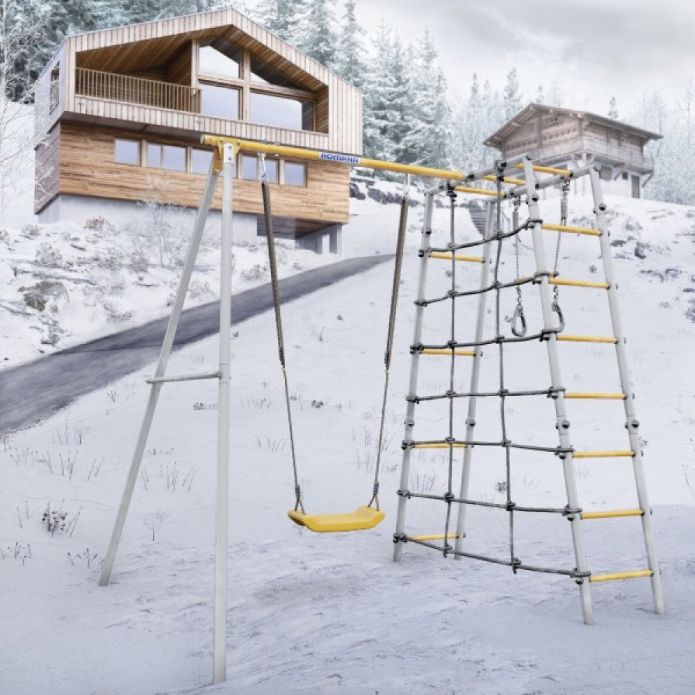 Комплектация: кольца с перекладиной, веревочный лаз, гимнастическая лестница, рукоход, качели пластиковые