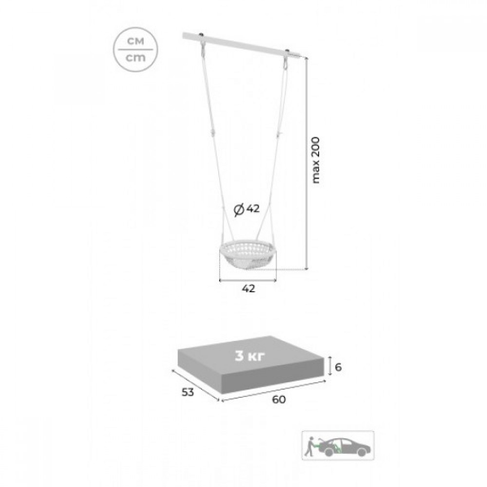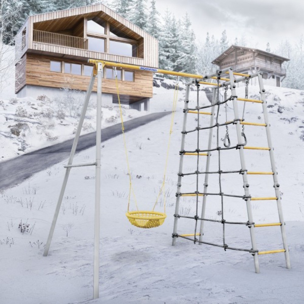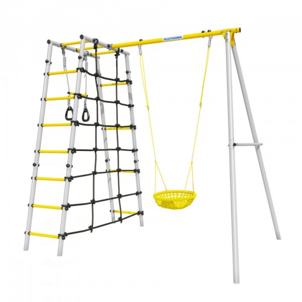 Комплектация: кольца с перекладиной, веревочный лаз, гимнастическая лестница, рукоход, качели сетка