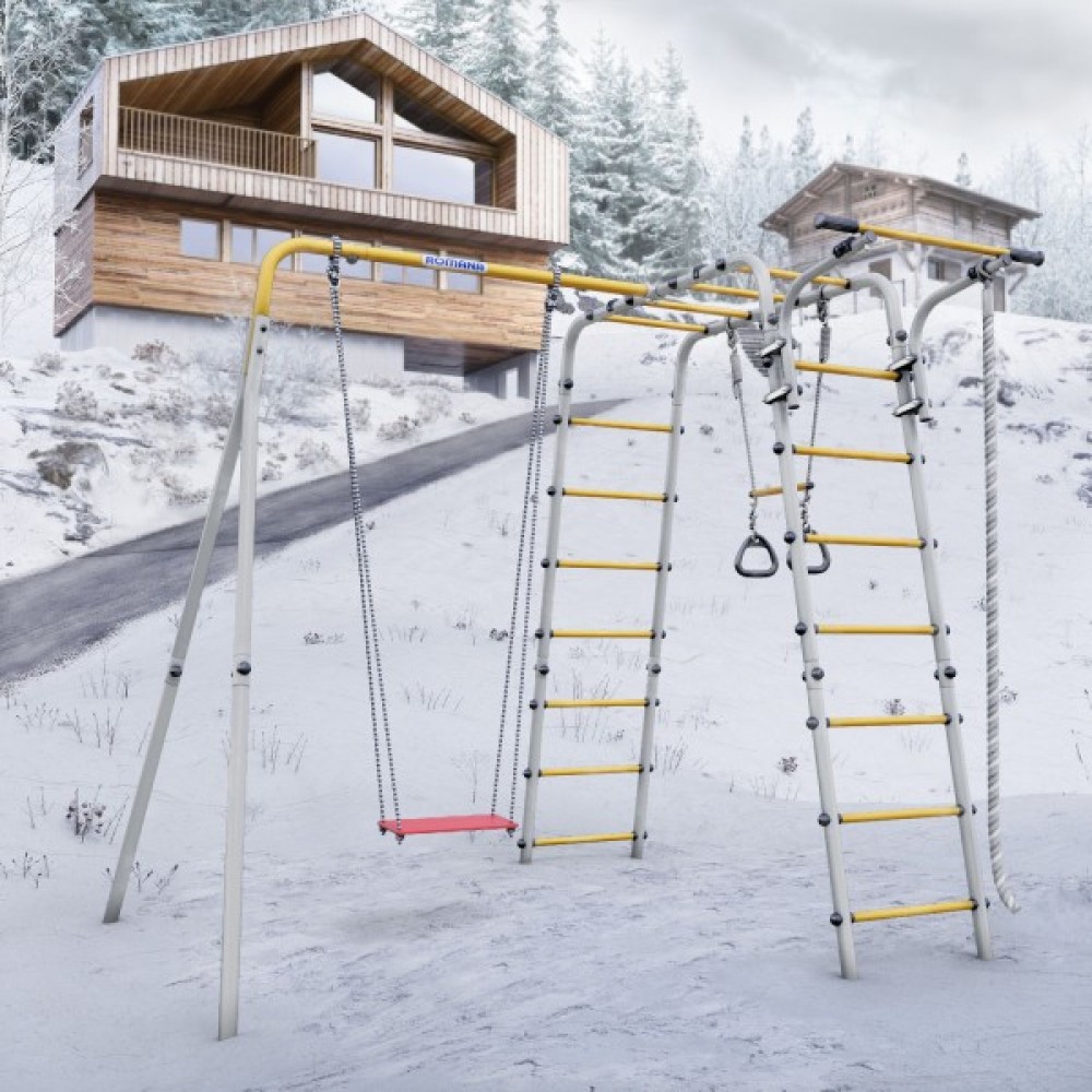 Комплектация: канат, кольца с перекладиной, гимнастическая лестница, рукоход, турник подвижный, качели фанерные