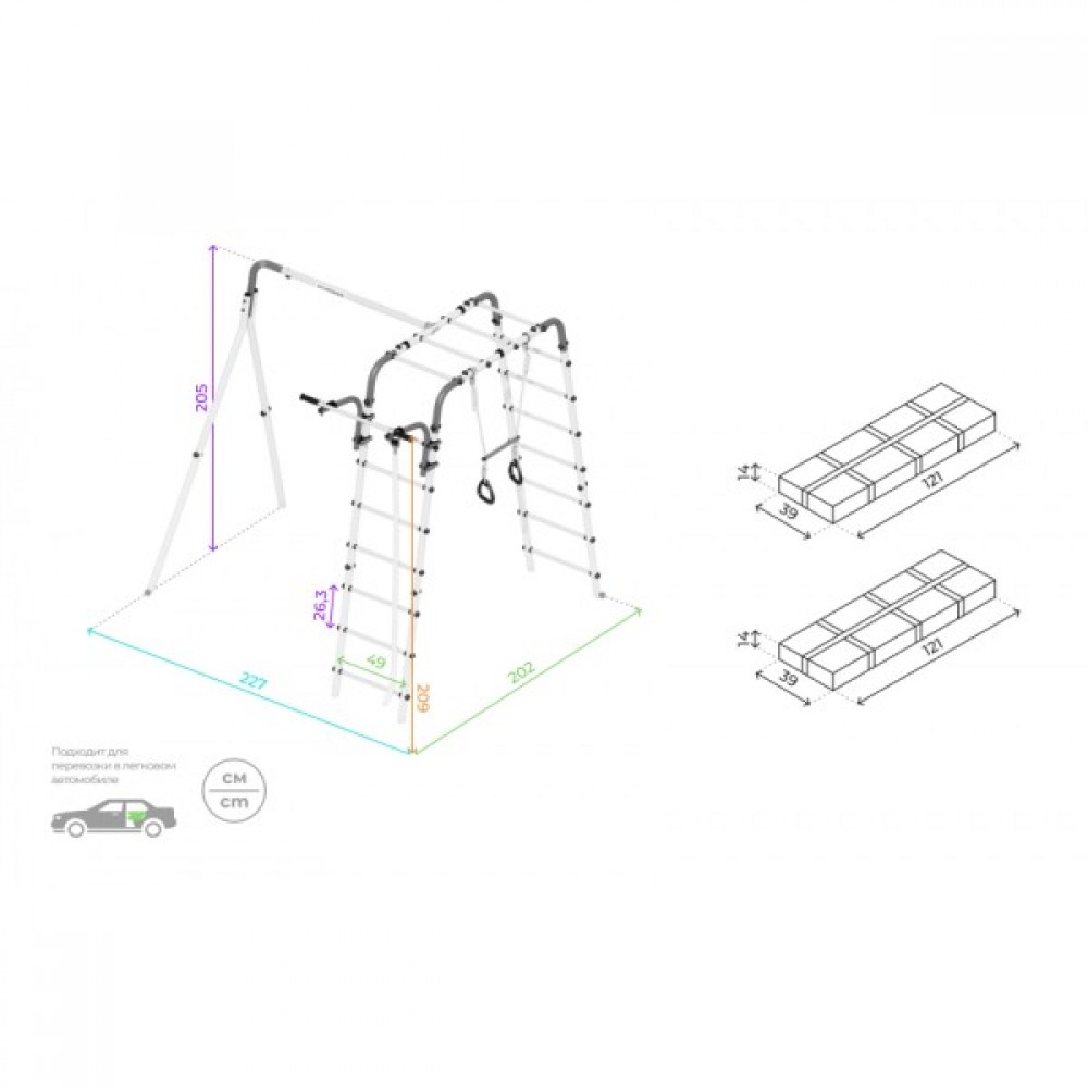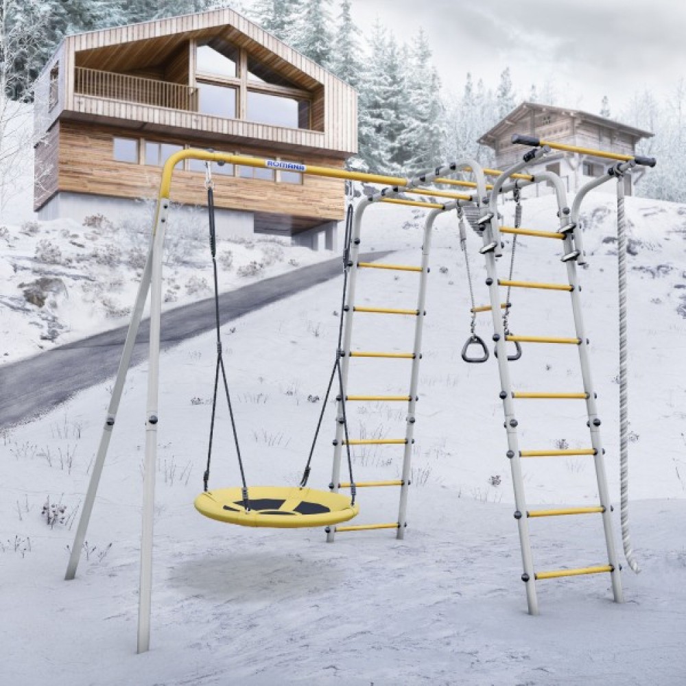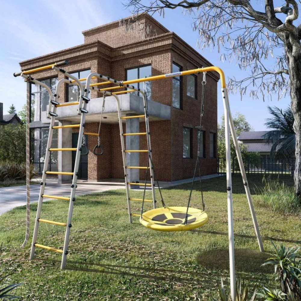 Комплектация: канат, кольца с перекладиной, гимнастическая лестница, рукоход, турник подвижный, качели гнездо