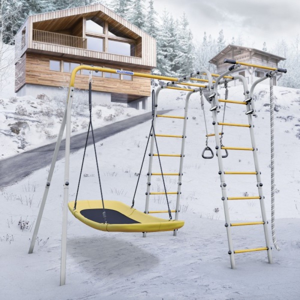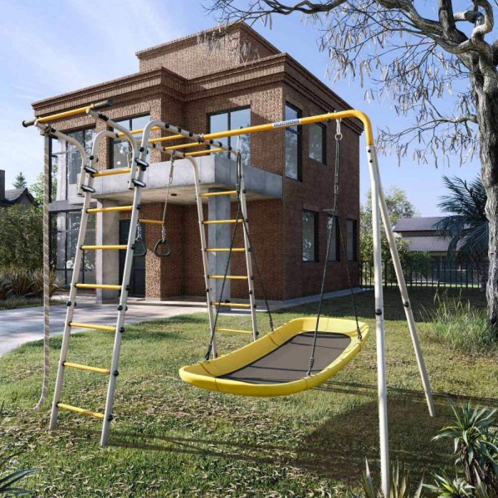 Комплектация: канат, кольца с перекладиной, гимнастическая лестница, рукоход, турник подвижный, качели лодка