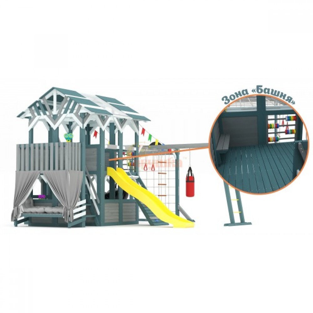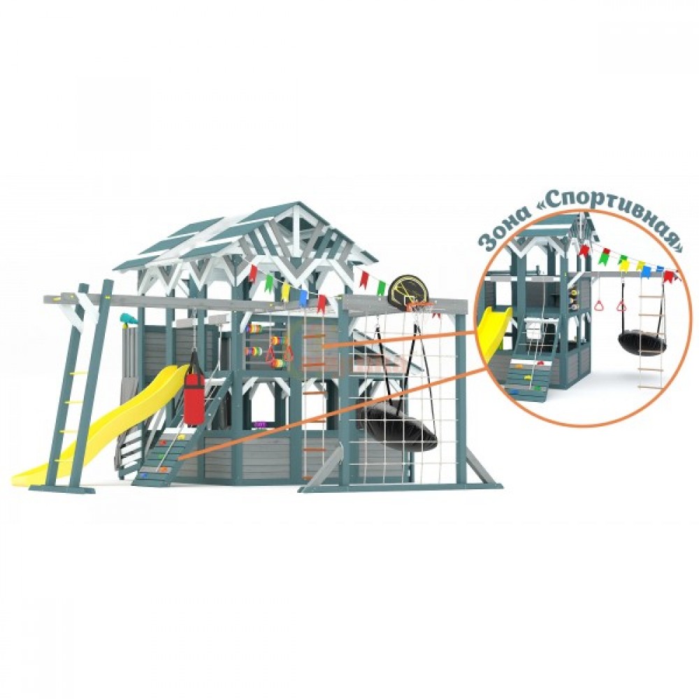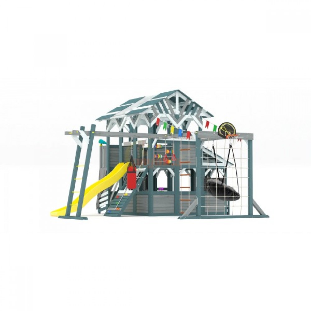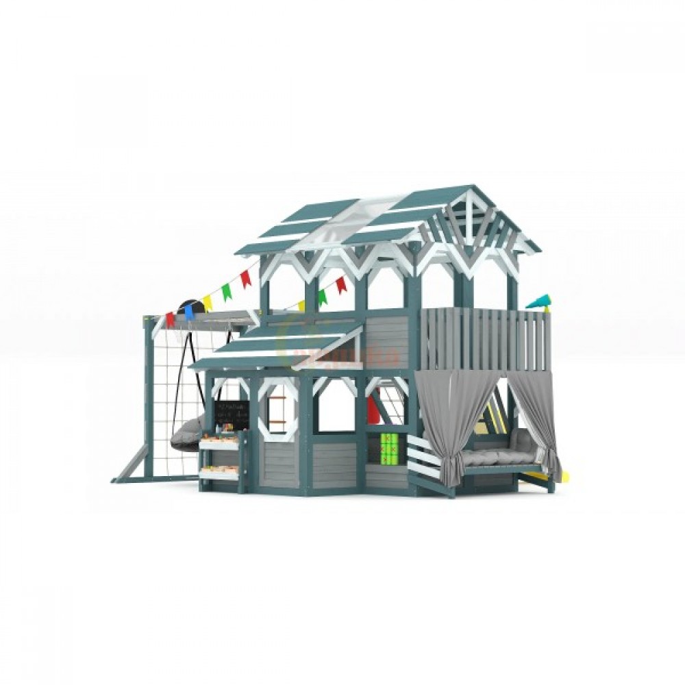 Этот комплекс сочетает в себе игровую и спортивную площадку, а также уютный детский домик с просторным игровым пространством. Он открывает двери в мир сказочных приключений для детей разного возраста (от 3 до 16 лет), развивая их физические способности и воображение.