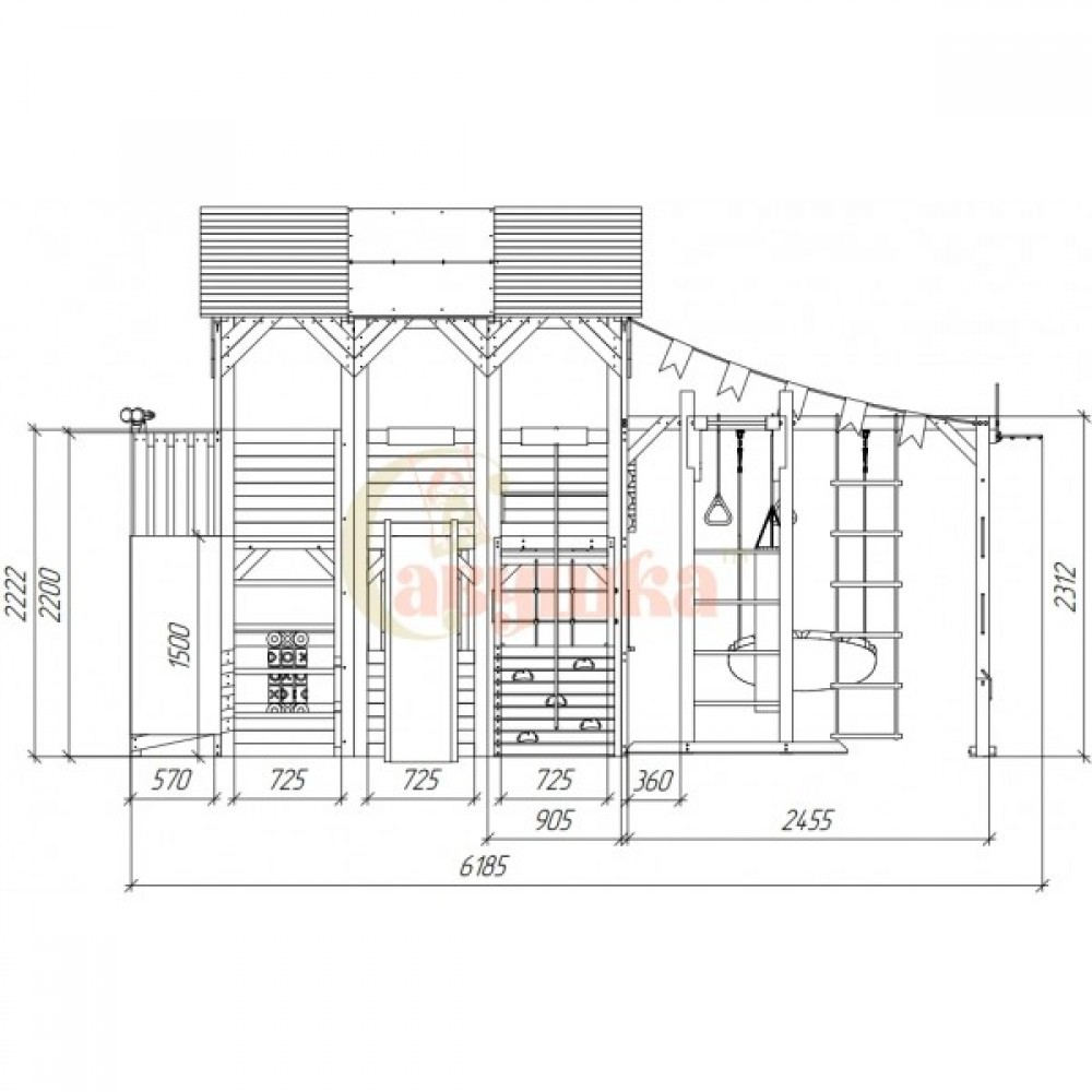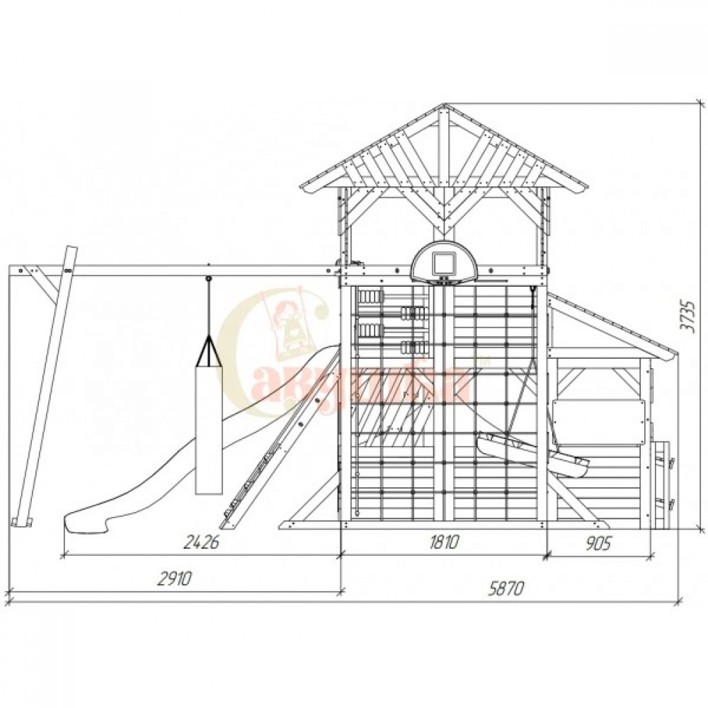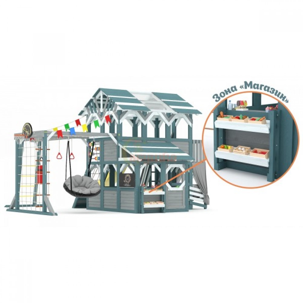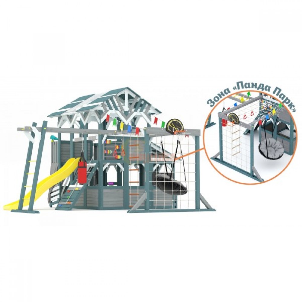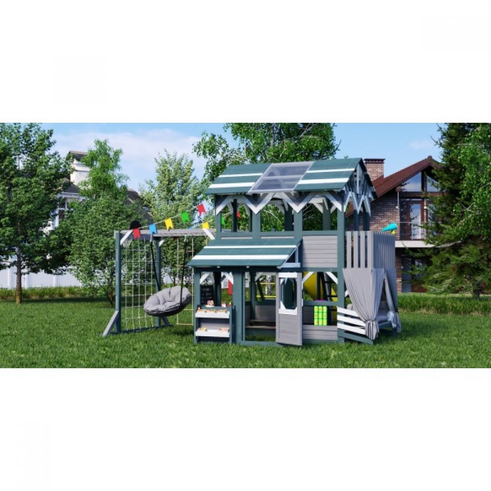 Этот комплекс сочетает в себе игровую и спортивную площадку, а также уютный детский домик с просторным игровым пространством. Он открывает двери в мир сказочных приключений для детей разного возраста (от 3 до 16 лет), развивая их физические способности и воображение.