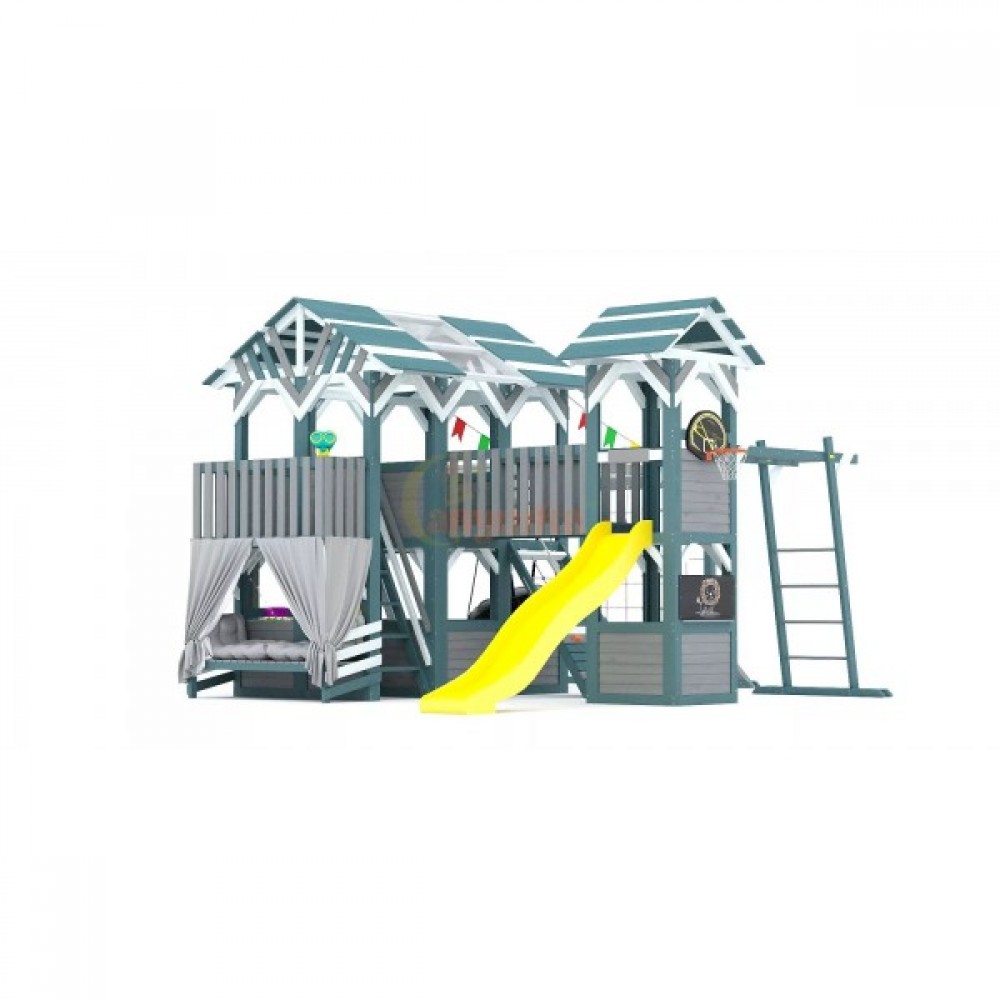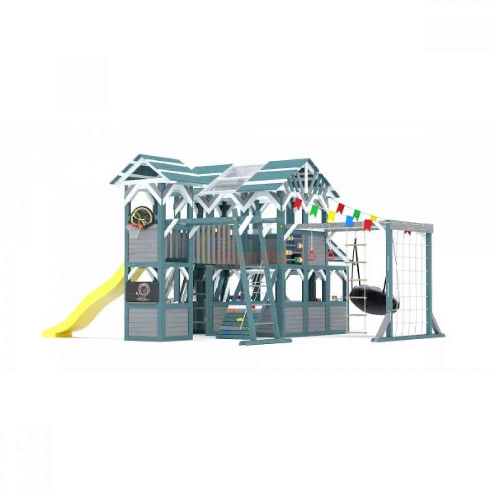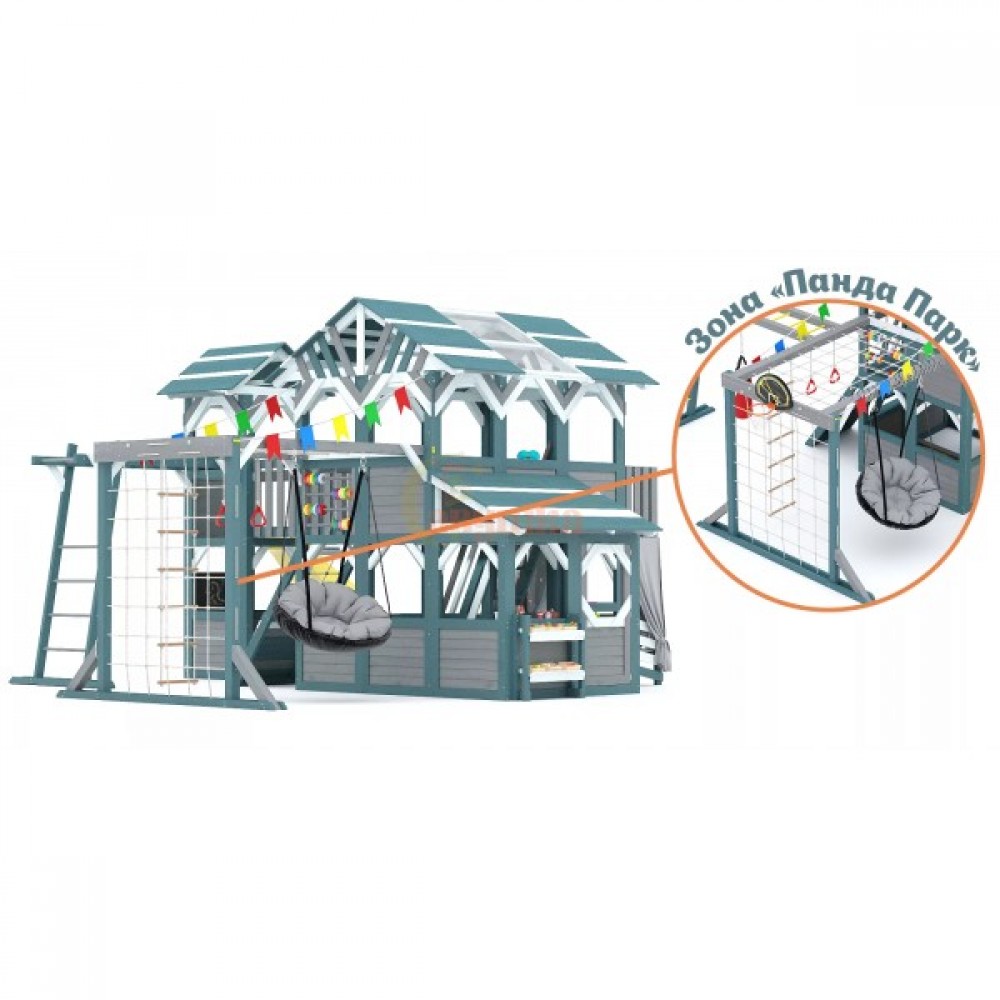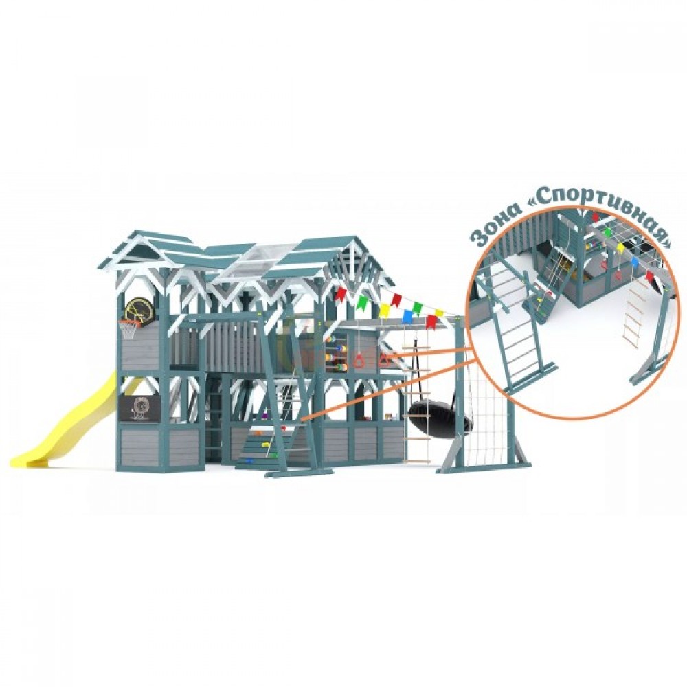 Этот комплекс сочетает в себе игровую и спортивную площадку, а также уютный детский домик с просторным игровым пространством. Он открывает двери в мир сказочных приключений для детей разного возраста (от 3 до 16 лет), развивая их физические способности и воображение.