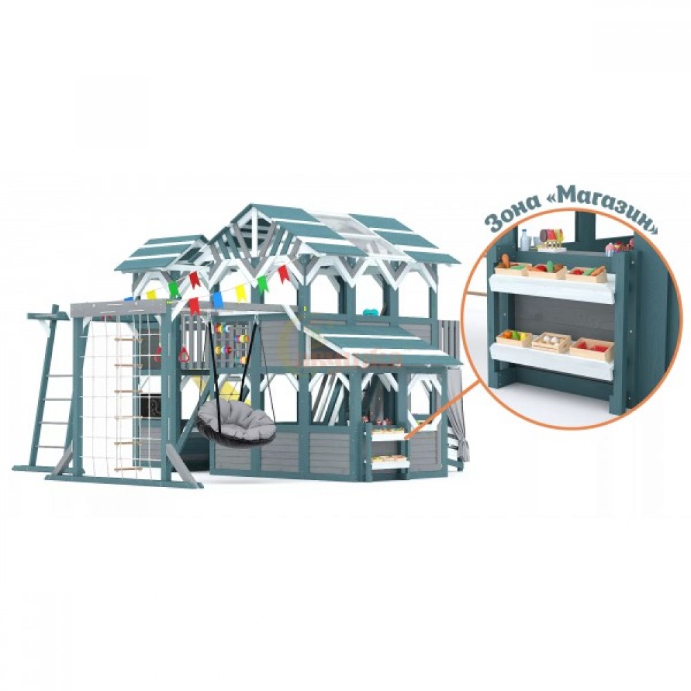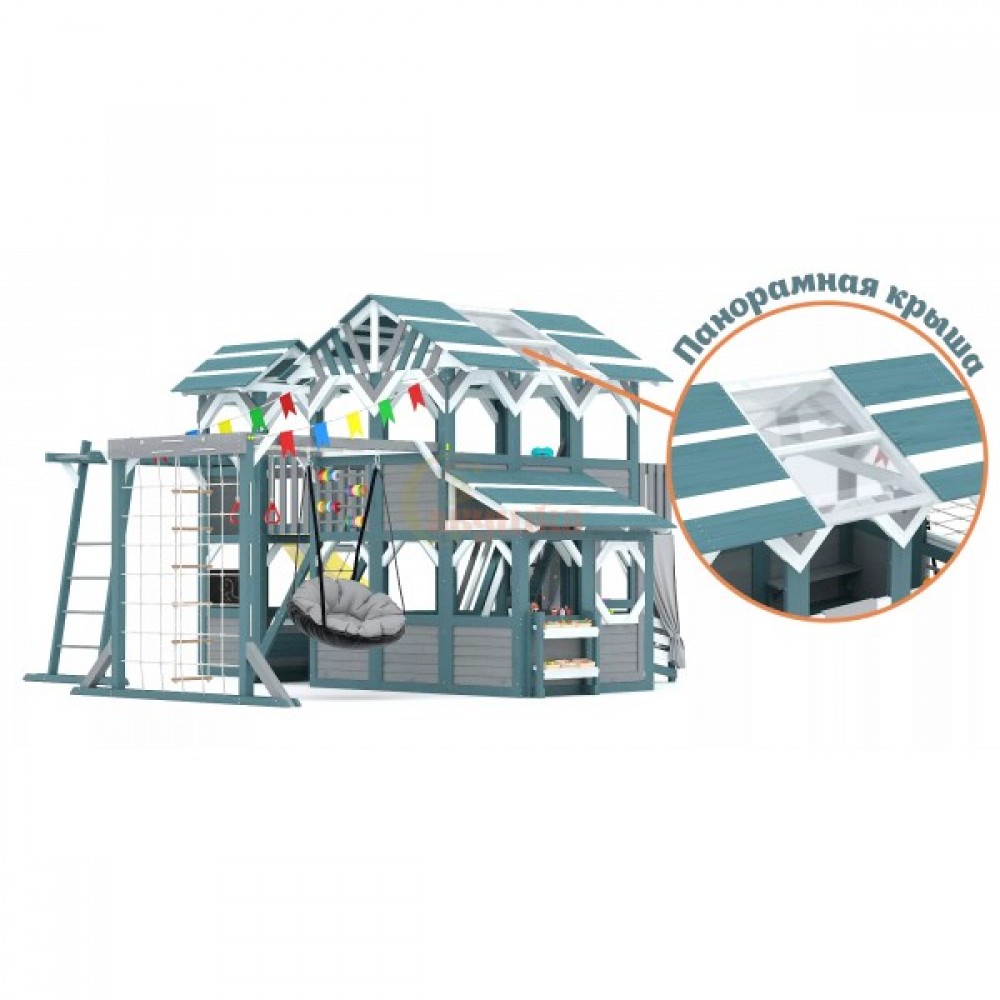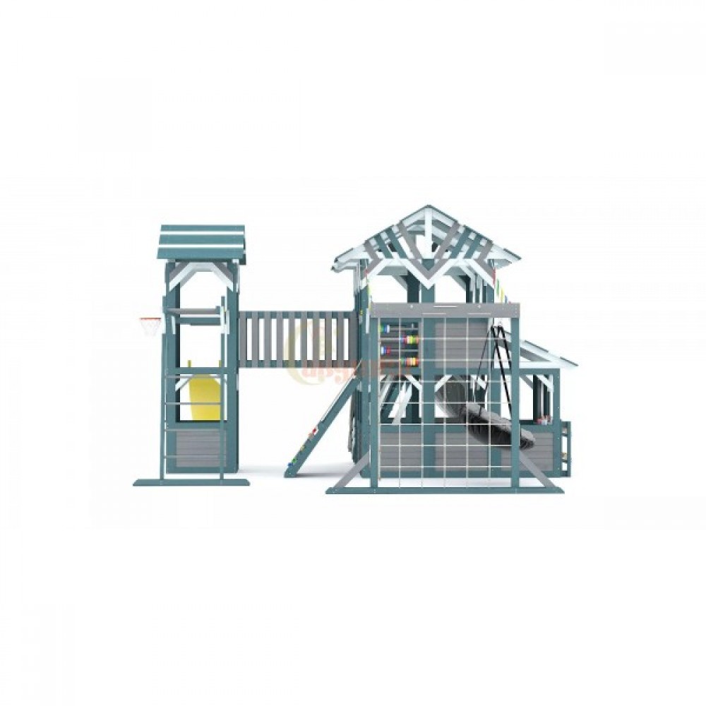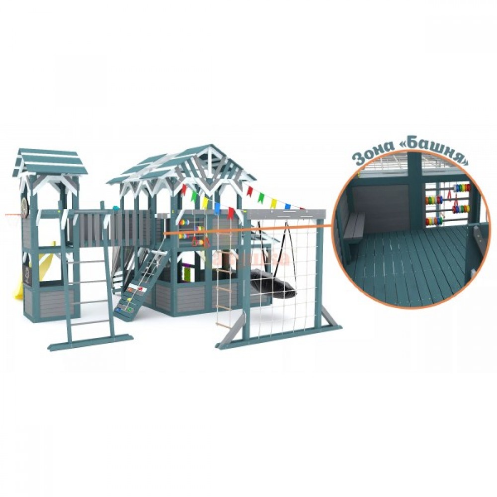 Этот комплекс сочетает в себе игровую и спортивную площадку, а также уютный детский домик с просторным игровым пространством. Он открывает двери в мир сказочных приключений для детей разного возраста (от 3 до 16 лет), развивая их физические способности и воображение.