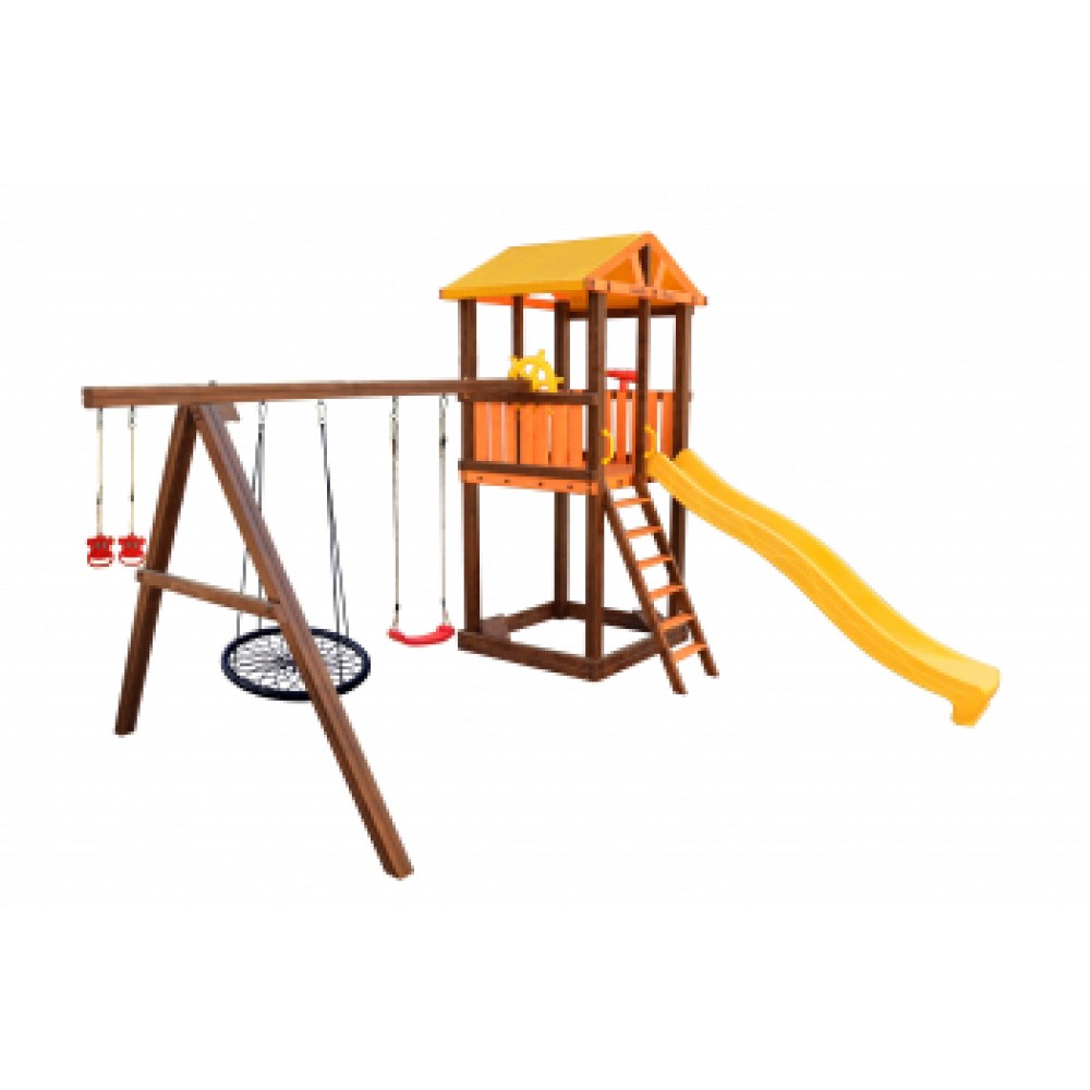- игровой домик, песочница, лестница, скат, ручка пластиковая - 2 шт, А-опция, качели "Лодочка" 2 шт, кольца "Микки", штурвал "Шторм", бинокль "Капитан", качели "Паутина"
