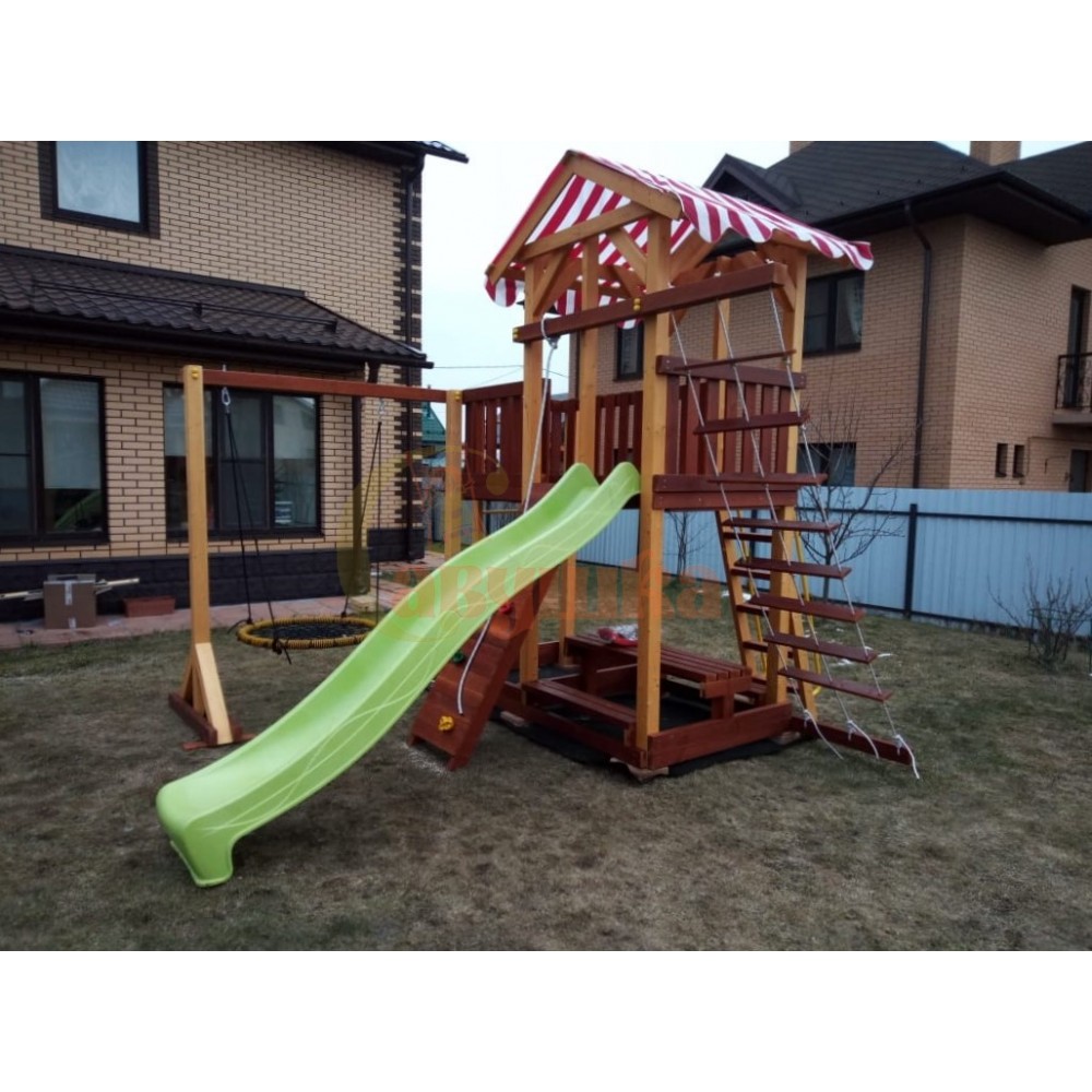 Скатиться с крутой пластиковой горки? Попробовать свои силы на настоящем скалодроме с канатом, или почувствовать себя матросом пиратской шхуны, карабкаясь к реям по шторм-трапу. Зачем делать выбор! Купив этот комплекс, вы также подарите детям возможность:• Играть в песочнице, или за небольшим, но удобным деревянным столиком с лавочками. Песочница рассчитана на двоих малышей, столик - на четверых;