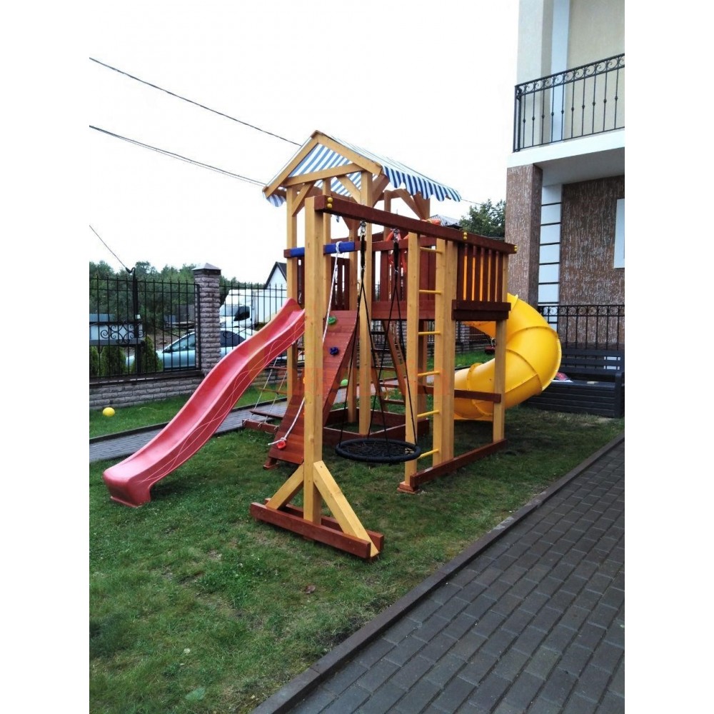Первое, на что обращают внимание мальчики и девочки - высокая игровая башня. Она имеет яркую крышу из ткани «Oxford», а также просторный балкон. Поднявшись на платформу (ее высота 1,5 метра) ребенок может спуститься вниз по одной из двух горок - винтовой или прямой (с одной волной). Обе горки сделаны из скользкого, устойчивого к износу и перепадам температур пластика. Его цвет можно выбрать.Для подъема на башню мы добавили в конструкцию привычную лестницу. Но есть и другой путь - скалодром. За его пластиковые зацепы удобно хвататься руками или становиться на них ногой в обуви. Ускорить процесс поможет канат.