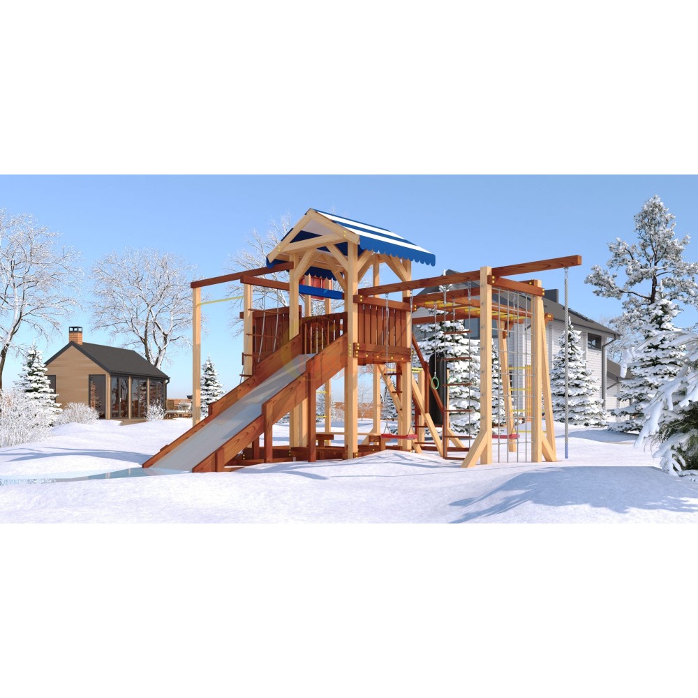 В центре комплекса - игровая башня с яркой двухцветной крышей из материала “Оксфорд”. Чтобы подняться в нее, нужно преодолеть сетку-лазалку, скалодром или лестницу-трап с узкими ступенями. Такие ежедневные мини-тренировки развивают у детей чувство равновесия, учат преодолевать страх и нерешительность. Спуститься вниз можно теми же путями, а также самым интересным и веселым - съехать по трехметровой горке. В зимний период горка может быть заменена на деревянный скат (поставляется в комплекте). Ширина ската 93 см позволяет кататься с него на ледянках и тюбингах.Под башней находятся столик и лавочки. Здесь могут оставаться как наблюдающие взрослые, так и малыши, занятые рисованием, лепкой, рукоделием.