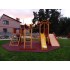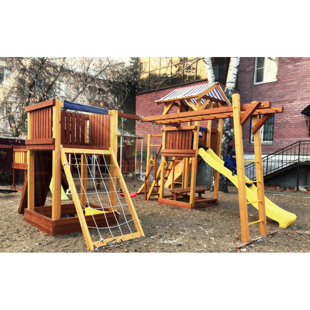 В комплексе две основных части - башня и домик. Высота платформ полтора метра от земли, детям до 9-10 лет удобно стоять под ними в полный рост.Башня оборудована крышей, всесезонной длинной горкой (в зимнее время ее можно заменить на широкий скат), шведской стенкой, турником. Под ней расположены песочница, столик и лавочки для тех, кто любит спокойные игры в уединении.