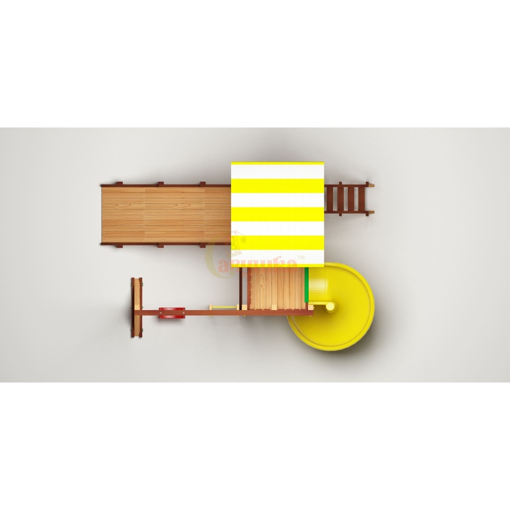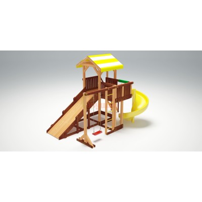 Обратно на землю можно спуститься двумя способами в зависимости от времени года. Летом - по пластиковой горке длиной 3000мм красного, желтого, зеленого или синего цвета. А зимой она заменяется на деревянной аналог длиной 3000мм и шириной 930мм с бортами. Очень удобно и безопасно для скатывания на тюбинге или ледянке! Для занятия спортом комплекс оснащен шведской стенкой, шторм-трапом и скалодромом с канатом. А потренировать вестибулярный аппарат можно на качелях Лодочка.