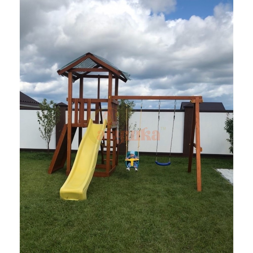 Комплекс имеет небольшие размеры и занимает минимум пространства. Большого выбора игрового оборудования тут нет. Однако это не способ экономии, а скорее формат, концепция позволяющая сделать площадку компактной. Каркас - деревянный. Положительно сказывается на сроке службы применение клееного бруса. Он не меняет форму с годами, не боится сырости или снега.