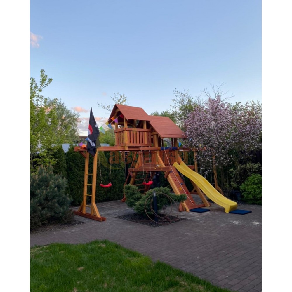 Для резвых и озорных детей в игровом комплексе есть веревочная лестница, сетка в раме и другие элементы. Также мы включили в комплектацию качели нескольких видов - «Дуэт», «Лодочка», «Шина» или «Гнездо» и классическую пластиковую горку.