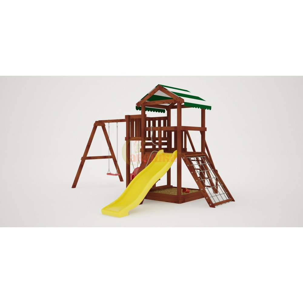 Поднявшись наверх можно поиграть на балкончике, с него будет открываться хороший вид на Ваш дачный участок. А быстро спуститься вниз малышам понравится с горки, цвет пластика на выбор: красный, желтый, зеленый, синий. Под платформой расположена квадратная песочница со сторонами 129 см, где можно более спокойно провести время, а отдохнуть на деревянной лавочке.