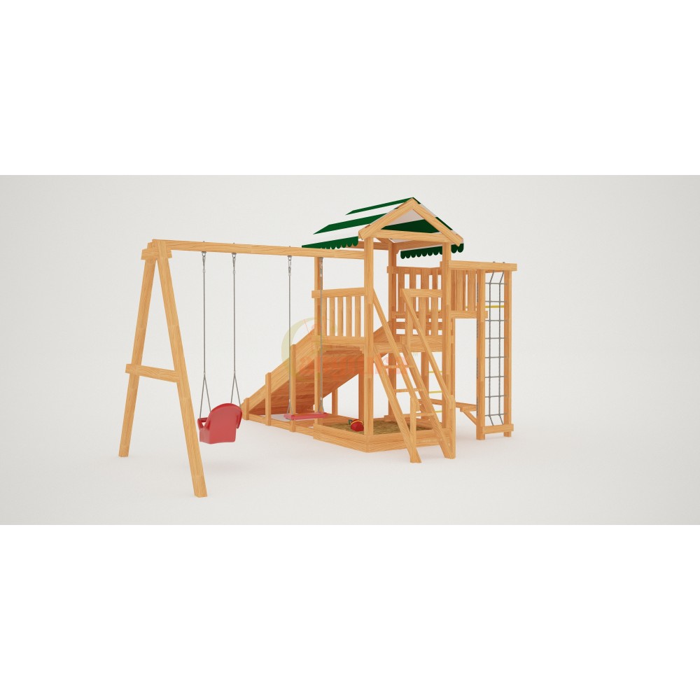 Игровая башня – центр спортивного строения с платформой на уровне 1200 мм от земли. Внизу расположилась песочница размером 1.29 м х 1.29 м и лавочка. В развитии силовых показателей помогут шведская стенка, сетка-лазалка, турник и рукоход.Подняться наверх детки могут по деревянной лестнице или более сложным способом – вскарабкаться по скалодрому с канатом, который оснащен удобными выступами для ножек. С пристроенного балкончика откроется хороший вид на весь загородный участок.
