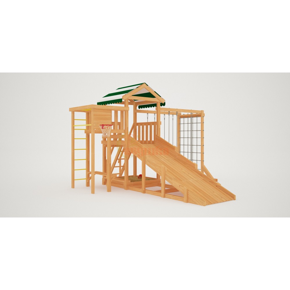 Укреплять мышечный каркас нужно с детства, бросая мяч в баскетбольное кольцо, вися на турнике и кольцах, карабкаясь по шведской стенке, канату, сетке-лазалке. Все это многообразие спортивных снарядов присутствует в «Мастер» #4. Для большей радости качели «Лодочка» и «Люкс» со спинкой. Наслаждайтесь и развивайтесь безопасно с игровым уличным комплексом Савушка.