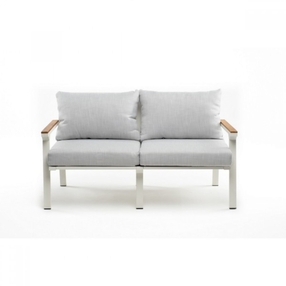 Каркас из алюминия с порошковым покрытием в белом матовом цвете обеспечивает защиту от коррозии, а элементы из массива тика, обработанные натуральным маслом, добавляют естественного тепла. Подушки в комплекте выполнены из водонепроницаемой ткани Olefin, цвет подушек светло-серый.