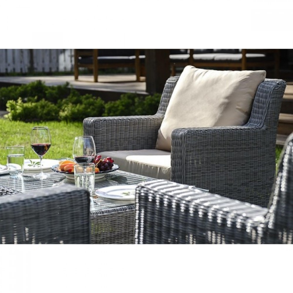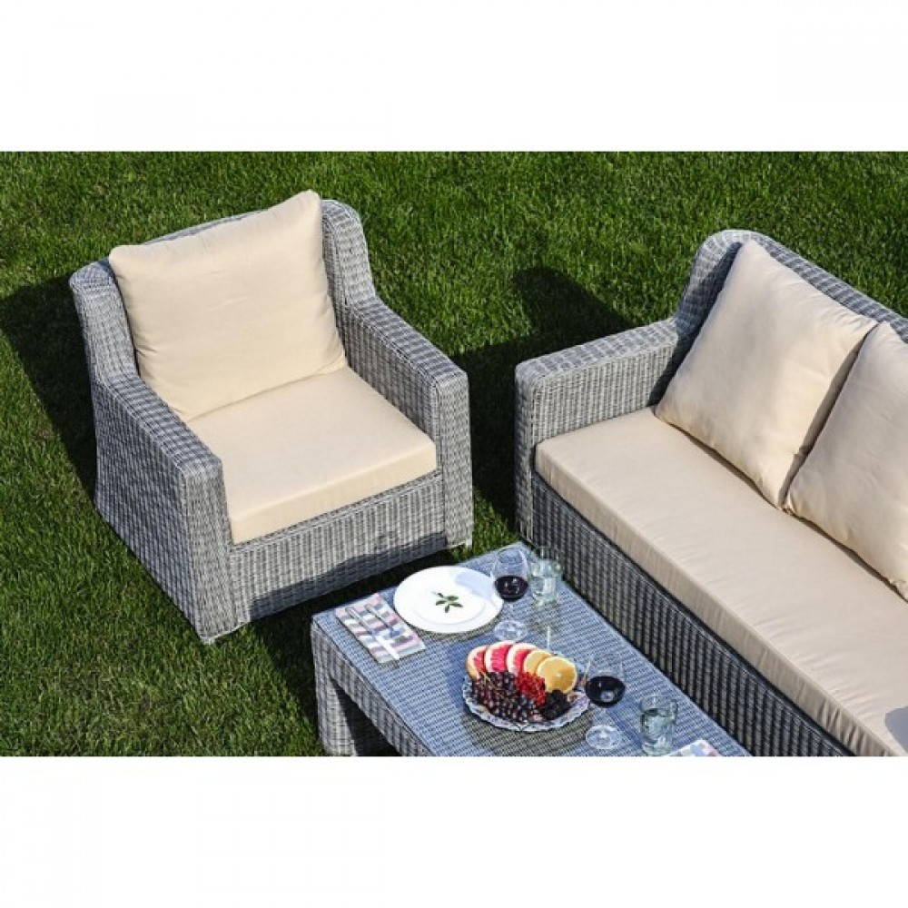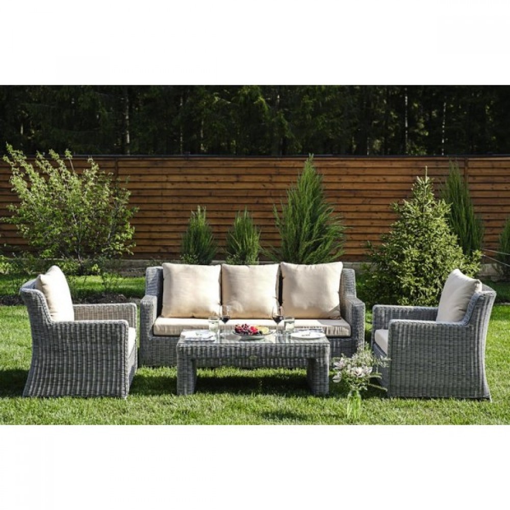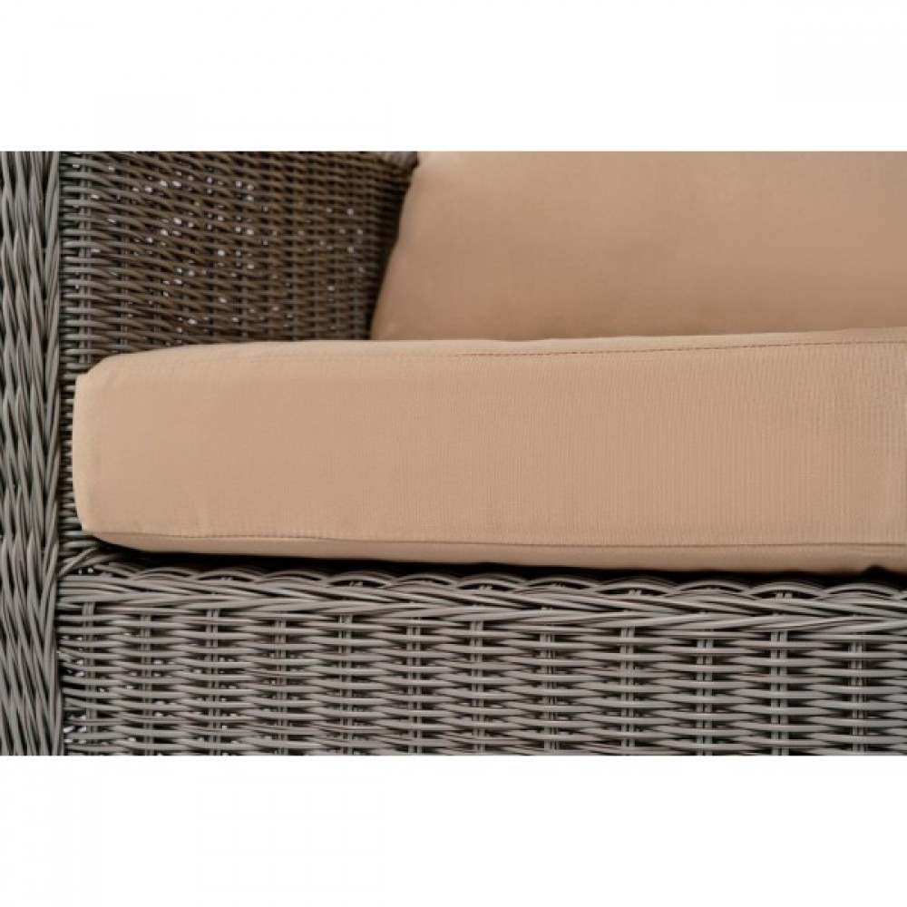 Комбинация элегантного круглого плетения оттенка серо-коричневый и бежевых подушек – достойный центр вашей загородной жизни!