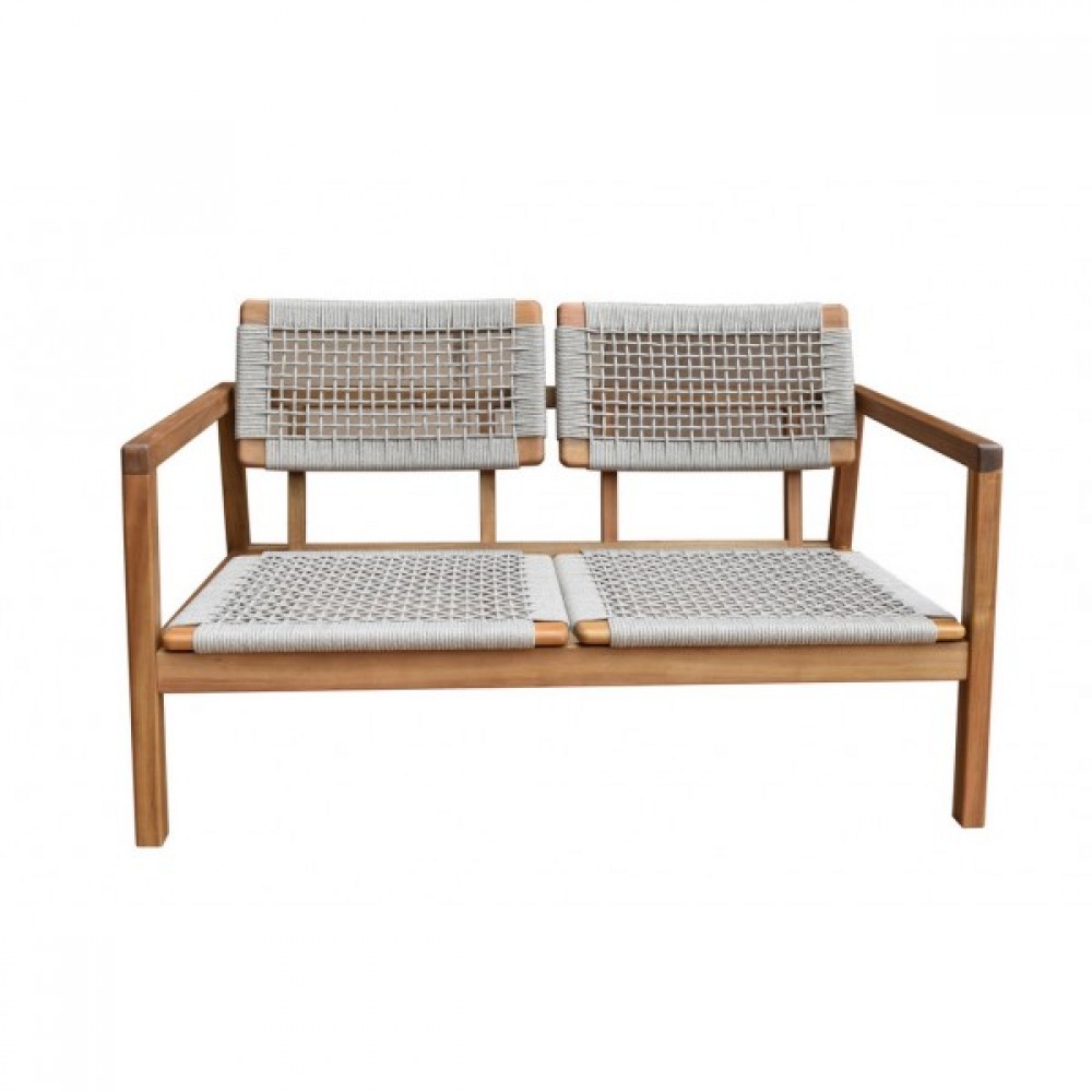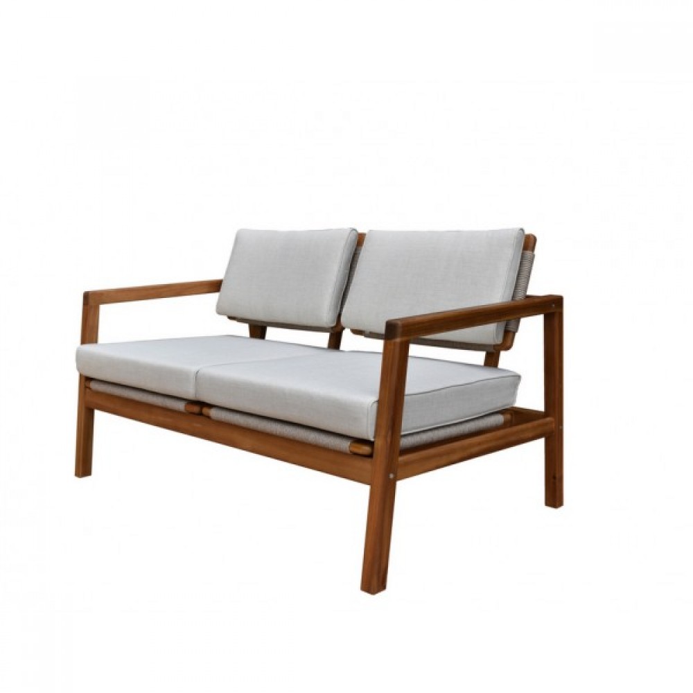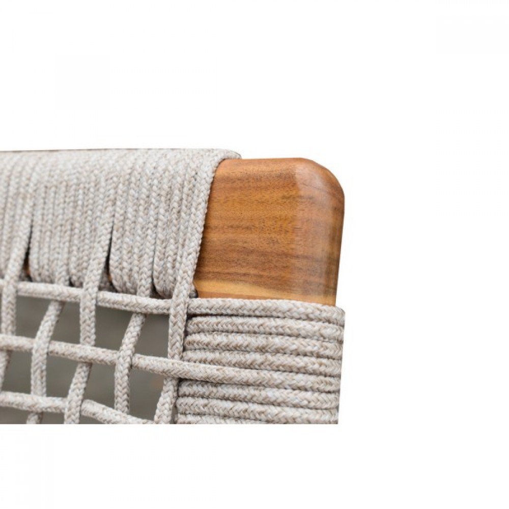 CALISTO – современная коллекция садовой мебели из акации, выполненная в комбинации натурального веревочного плетения rope, массива акации и бежевых подушек.