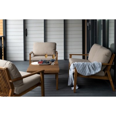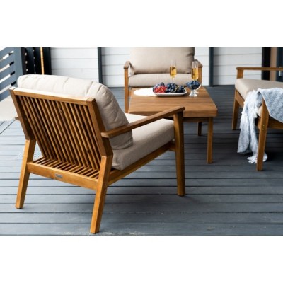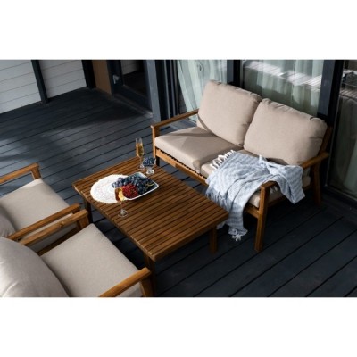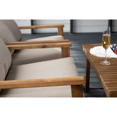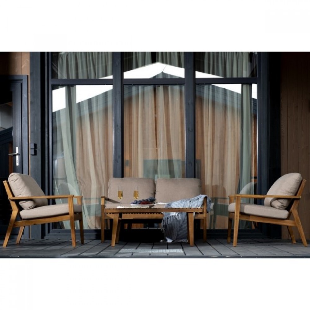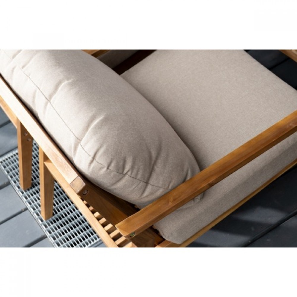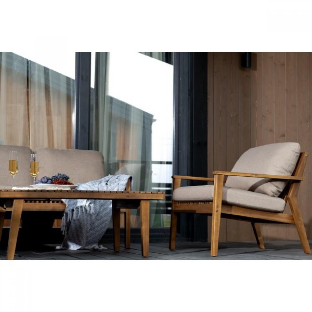 MONA – современная коллекция садовой мебели из акации в скандинавском стиле в комбинации массива акации и бежевых подушек.