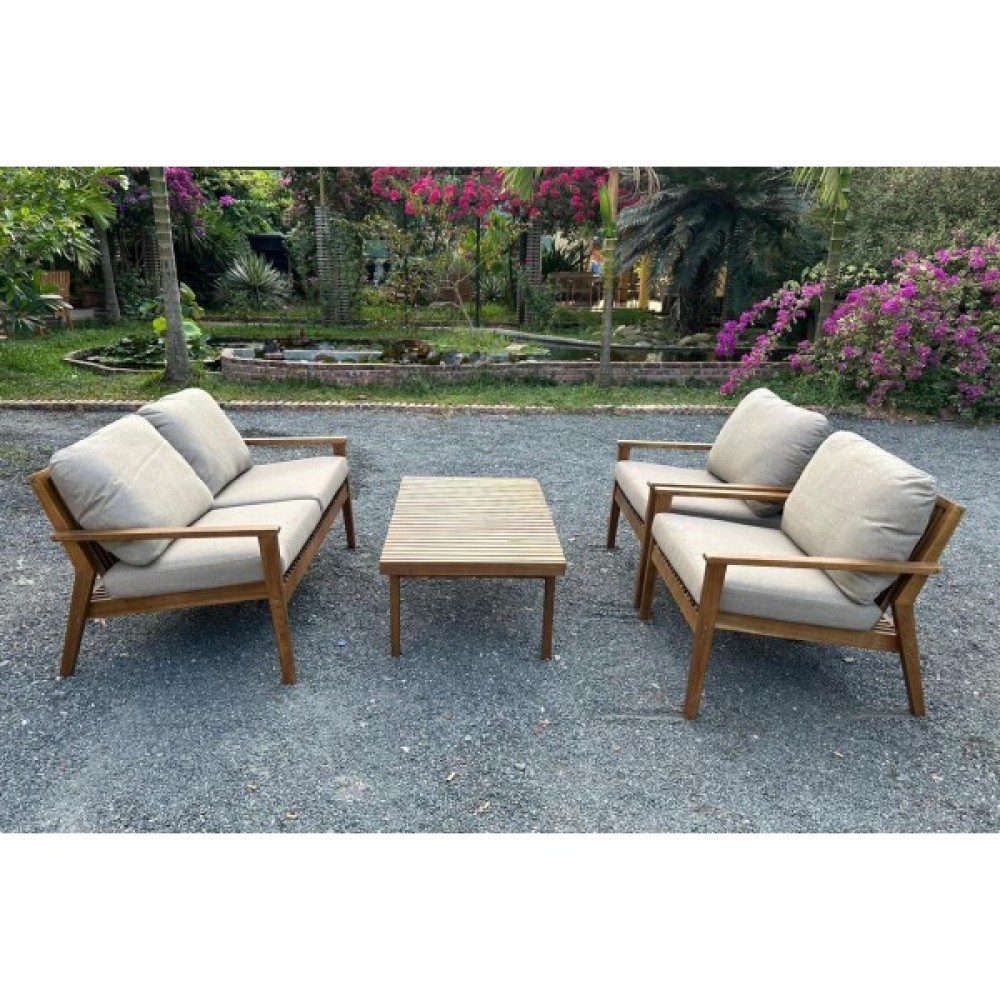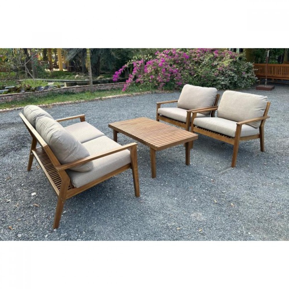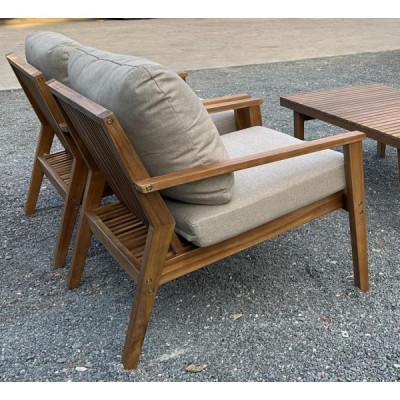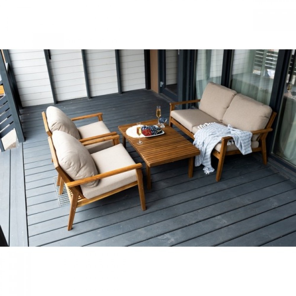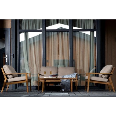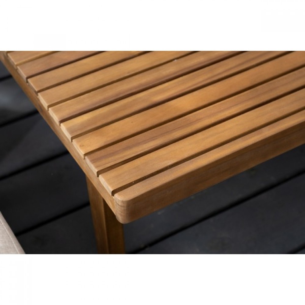 MONA – современная коллекция садовой мебели из акации в скандинавском стиле в комбинации массива акации и бежевых подушек.
