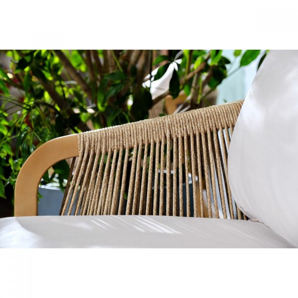 RIMINI – современная коллекция садовой мебели из акации, выполненная в комбинации натурального веревочного плетения rope, массива акации и бежевых подушек.