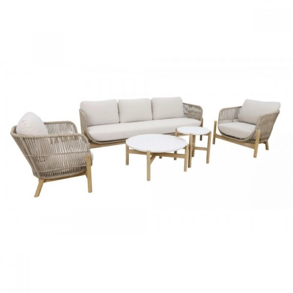 Сочетание натурального экошнура и массива тика в комбинации с бежевыми подушками грубой фактуры