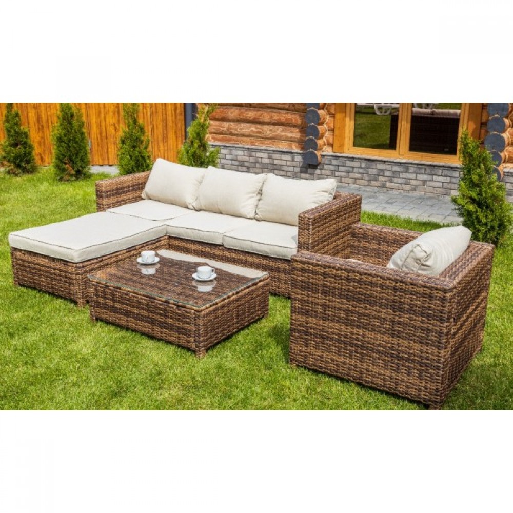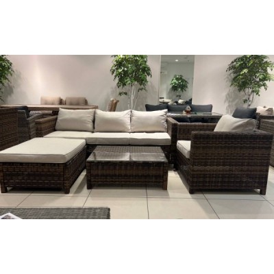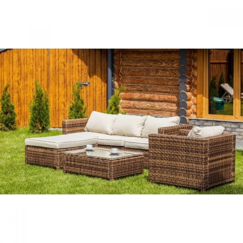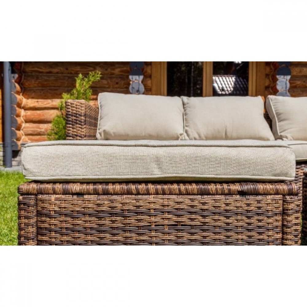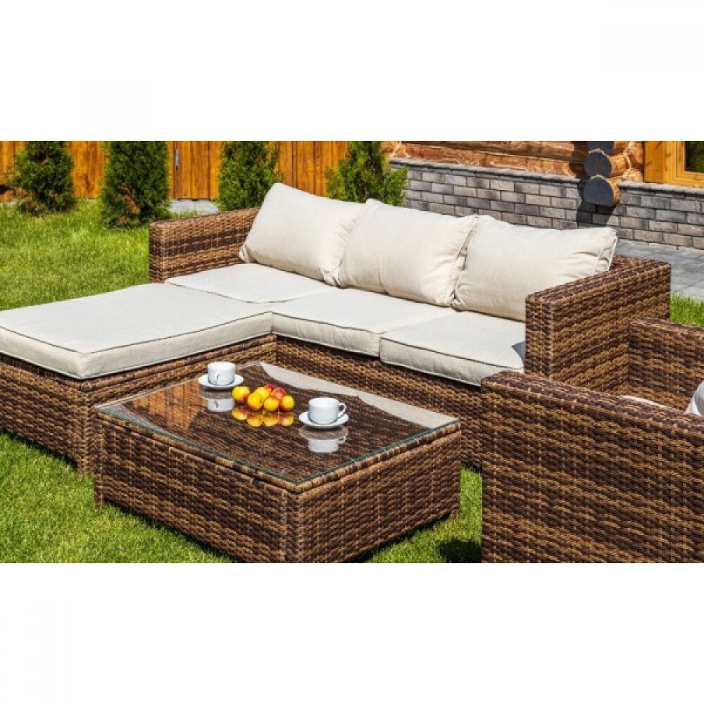 Угловой комплект уличной мебели GRAND VICKY из техноротанга выполнен в современном сдержанном дизайне с использованием натуральных коричневых оттенков. Благодаря компактным габаритам набор можно установить не только на территории приусадебного участка, но и на небольшой придомовой террасе.