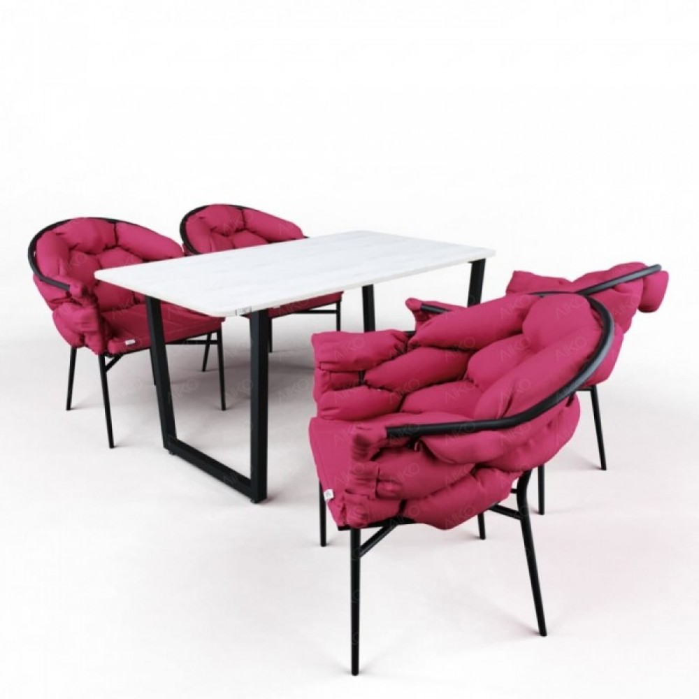 Сочетание легкости и прочности. Мягкое кресло Fluffy в тандеме со столом Myata на металлическом каркасе от AIKO красивое обустройство обеденной зоны интерьера.