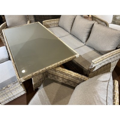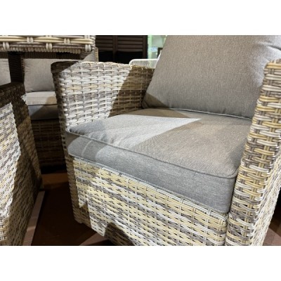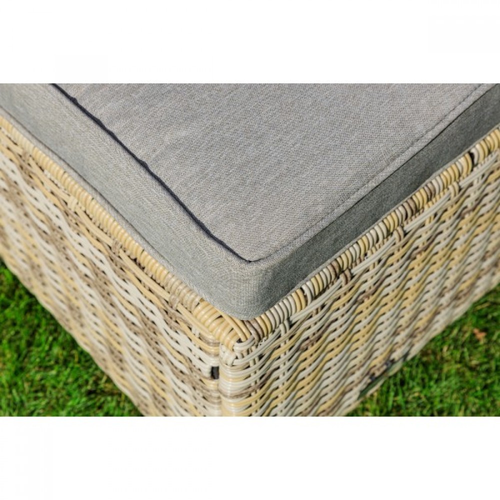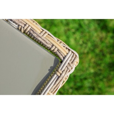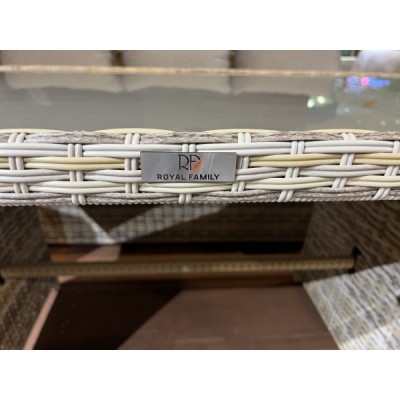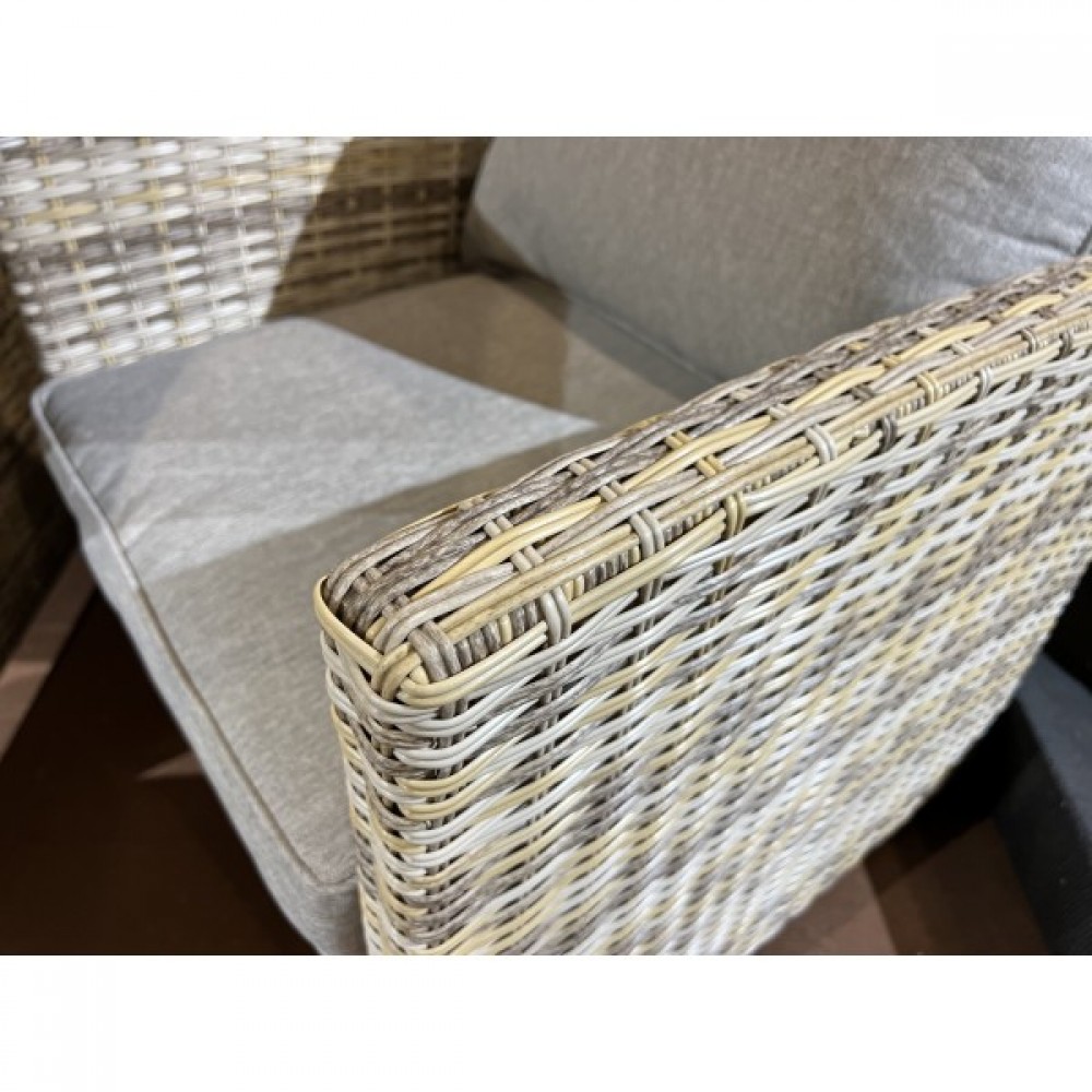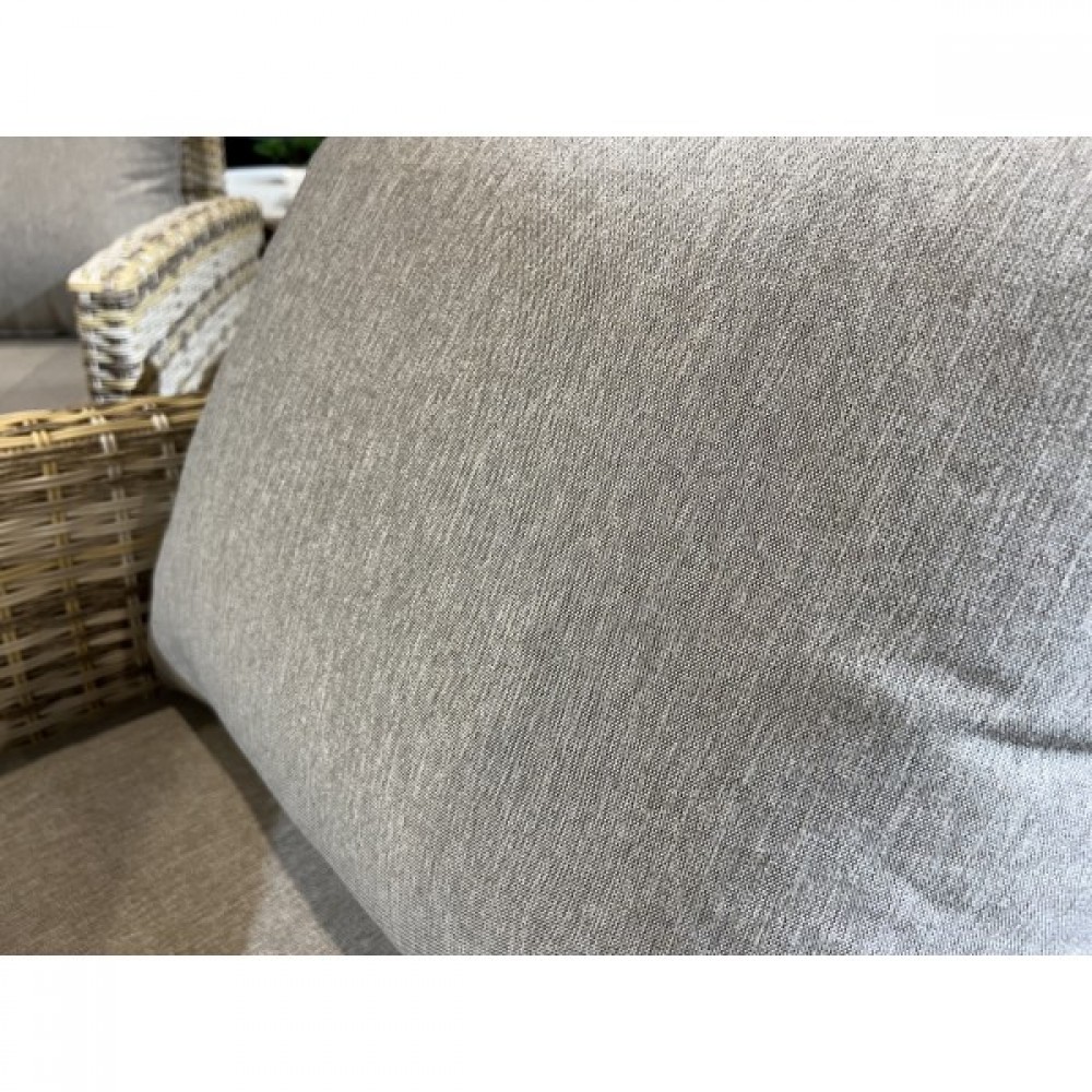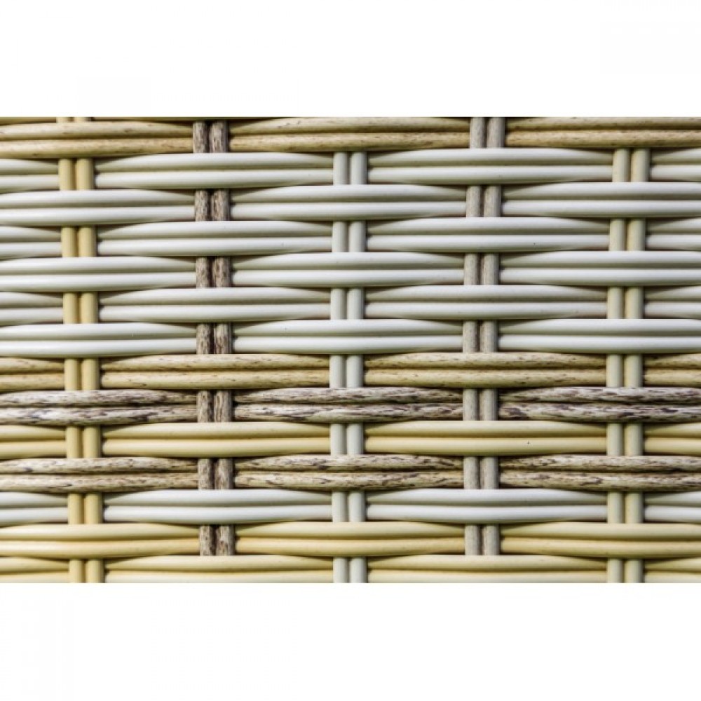 Мягкие подушки светло серого цвета с чехлами из водоотталкивающей ткани добавляют удобства и стиля. Вам не придется скрывать подушки при дожде. Особенностью гарнитуры является ручное плетение техноротанга в бежевом цвете, что придает ей современный и лаконичный вид, вписываясь идеально в любое окружение — будь то уединенный приусадебный сад или уютная терраса перед домом.