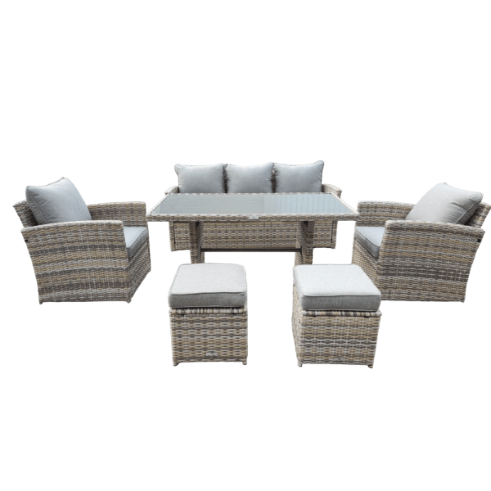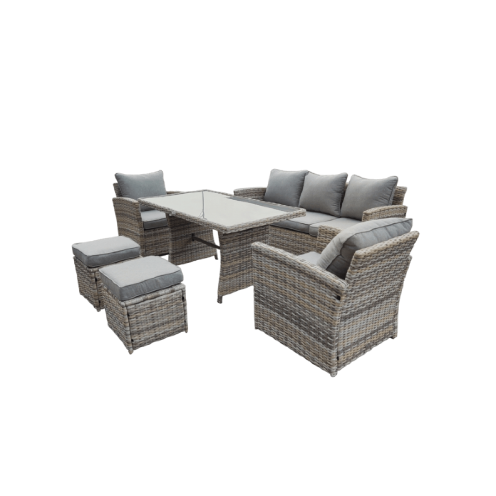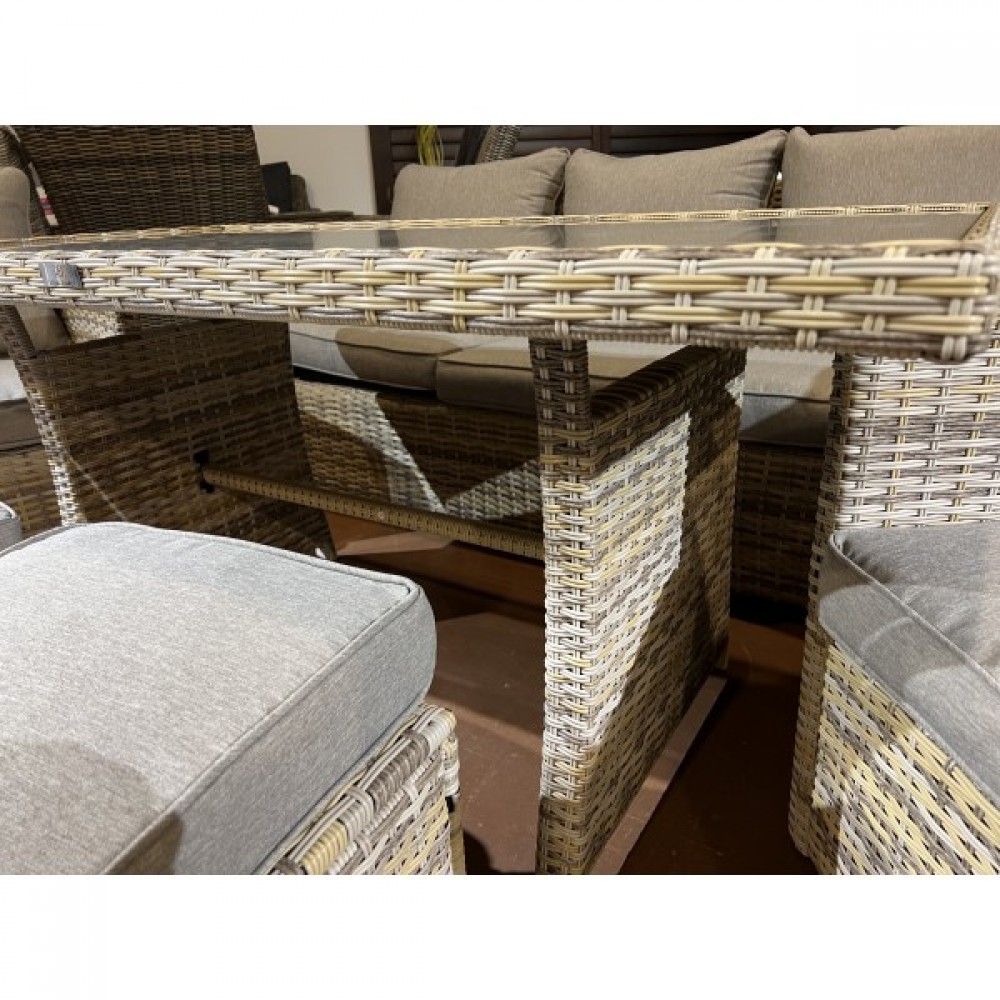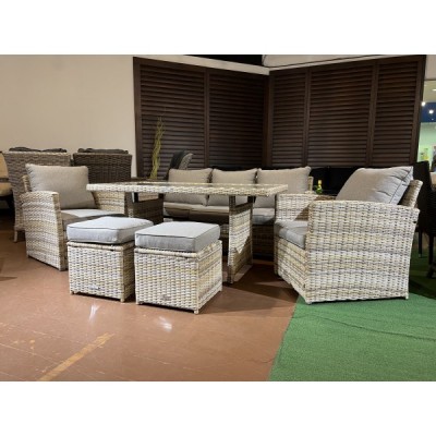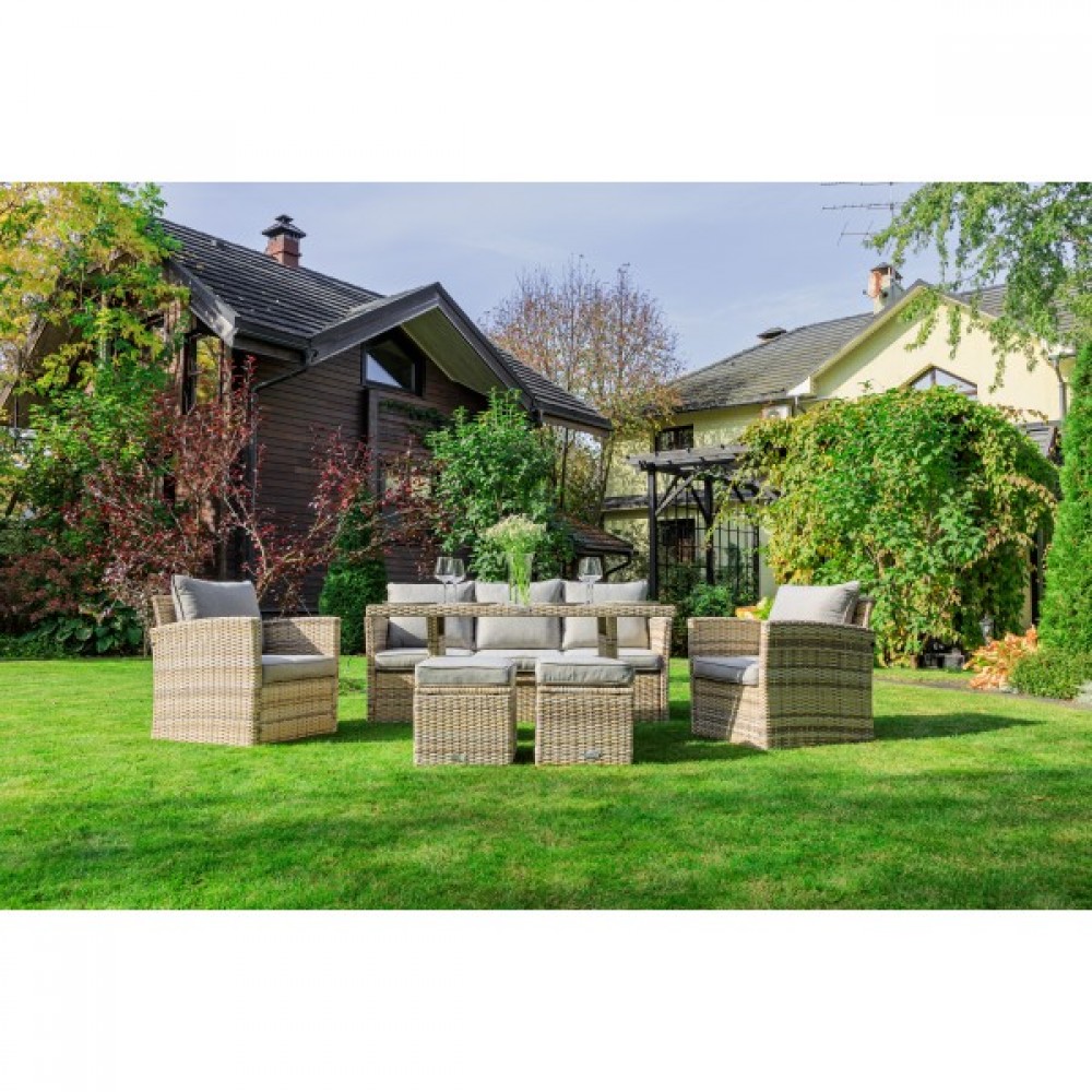 Добро пожаловать в мир элегантных и удобных наслаждений с комплектом садовой мебели ZOYA. Изготовленный из искусственного ротанга бежевого цвета, этот комплект сочетает в себе лучшие качества традиционных обеденных гарнитуров и уютных лаунж-зон. Позвольте себе наслаждаться семейными трапезами и отдыхом на протяжении всего года.