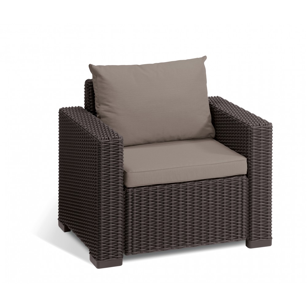 Комплект мебели California 3 Seater (Калифорния) Комплект мебели California 3 Seater - хит сезона 2014 года, так как мебель представлена в цвете каппучино с бежевыми подушками, что выделяет его из всей линии мебели Keter Group (Keter, Allibert, Curver, Jardin). Этот цвет особенно популярен в Европе и сейчас завоевывает позиции на российском рынке. Особенную комфортабельность комплекту мебели из пластика под искуственный ротанг California 3 Seater придают высокая спинка и наличие подушек для спинки. Диван достаточно большой - на нем могут поместиться 4 человека, а так же прочный - он выдерживает вес до 120 кг на одно посадочное место. Преимущества 1) Эргономичный дизайн 2) Сделано из прочного пластика 3) Неметаллическая рама- не ржавеет и не гниет 4) Легкая сборка 5) Благодаря стойкому к высоким температурам полипропилену, цвета не выгорают и не бледнеют