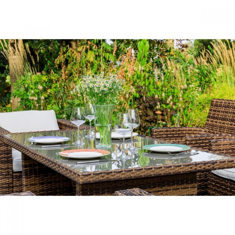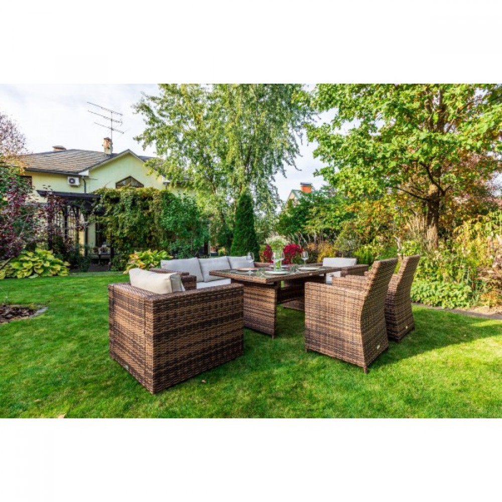 Комплект мебели KARL с обеденным столом в коричневом цвете — это элегантное и удобное решение для вашей столовой или гостиной. Он состоит из трехместного дивана, двух кресел и обеденного стола, изготовленных из искусственного ротанга на металлическом каркасе.